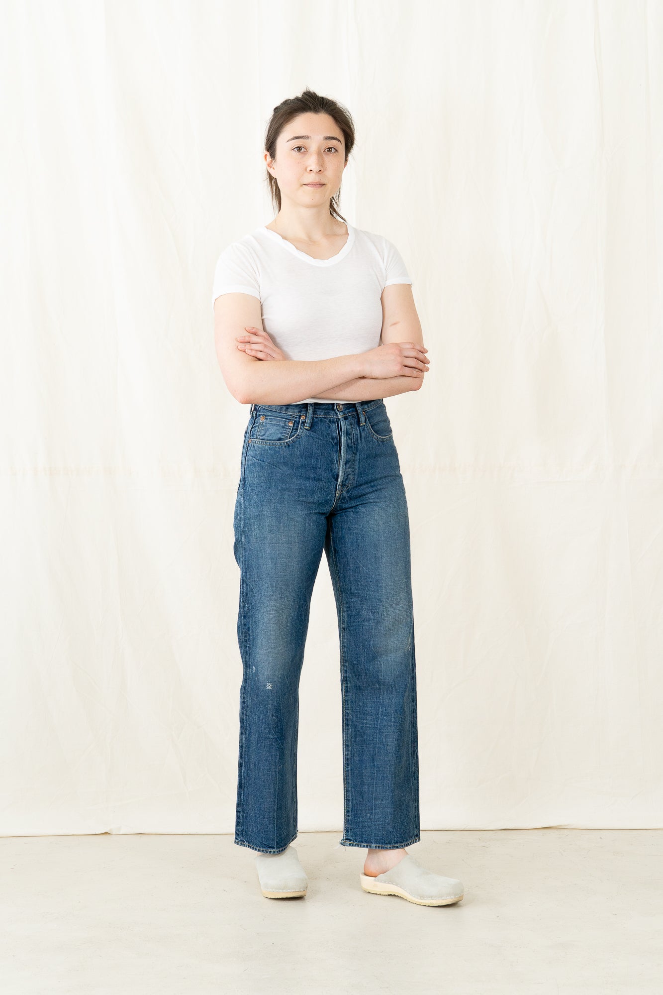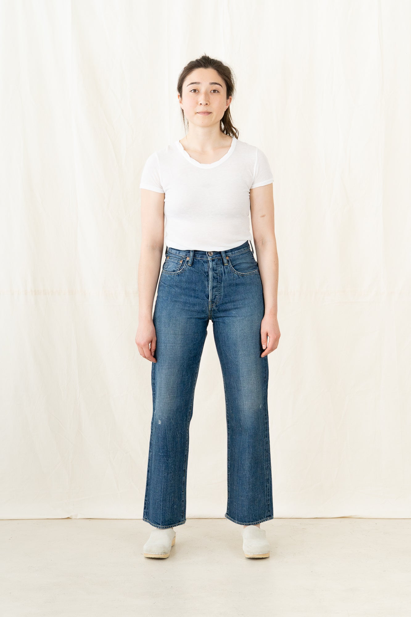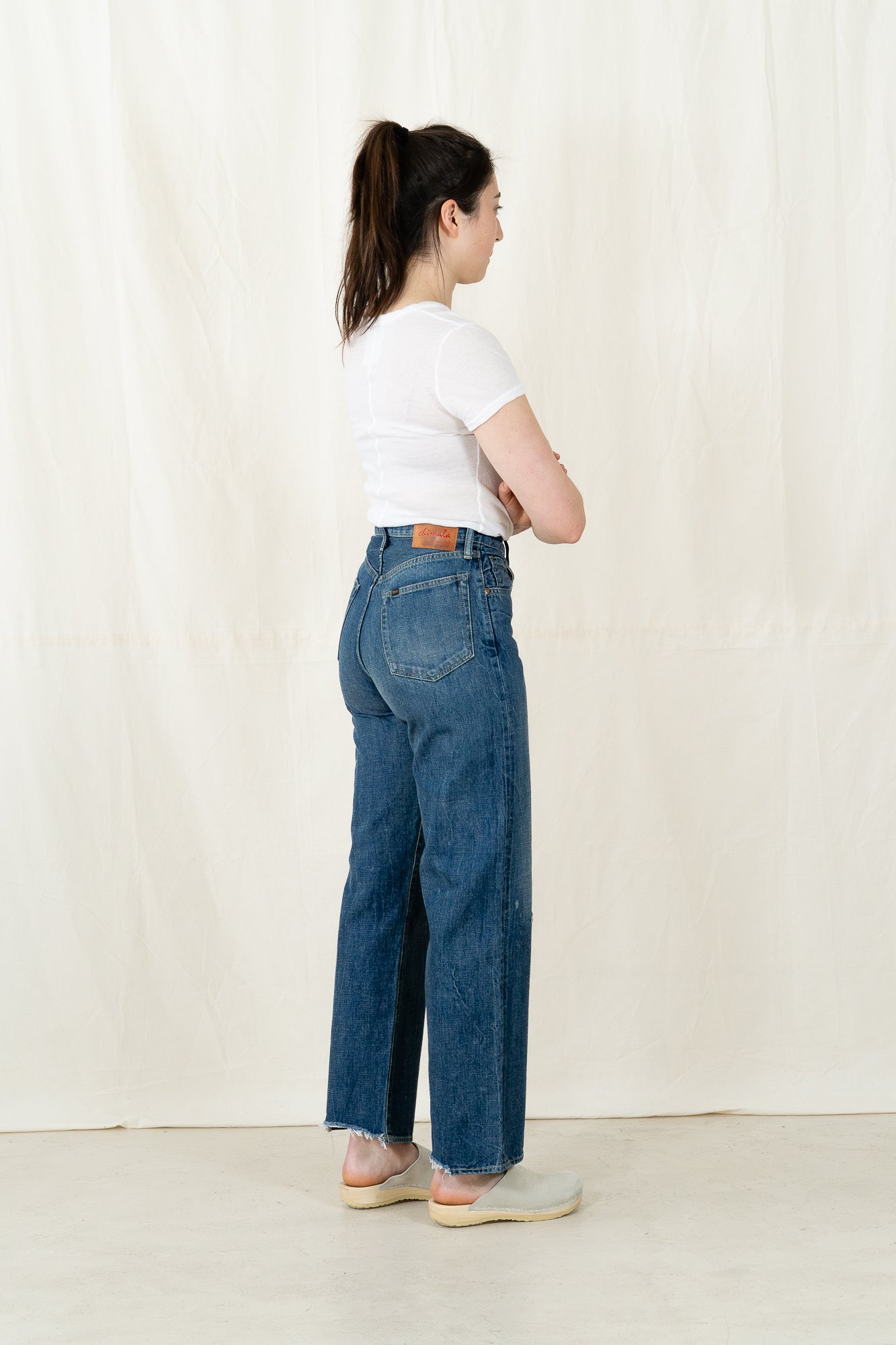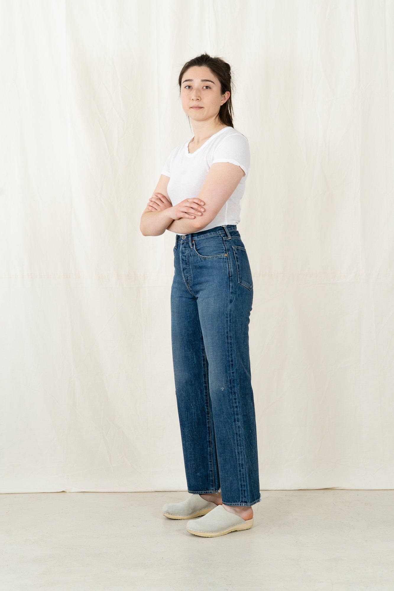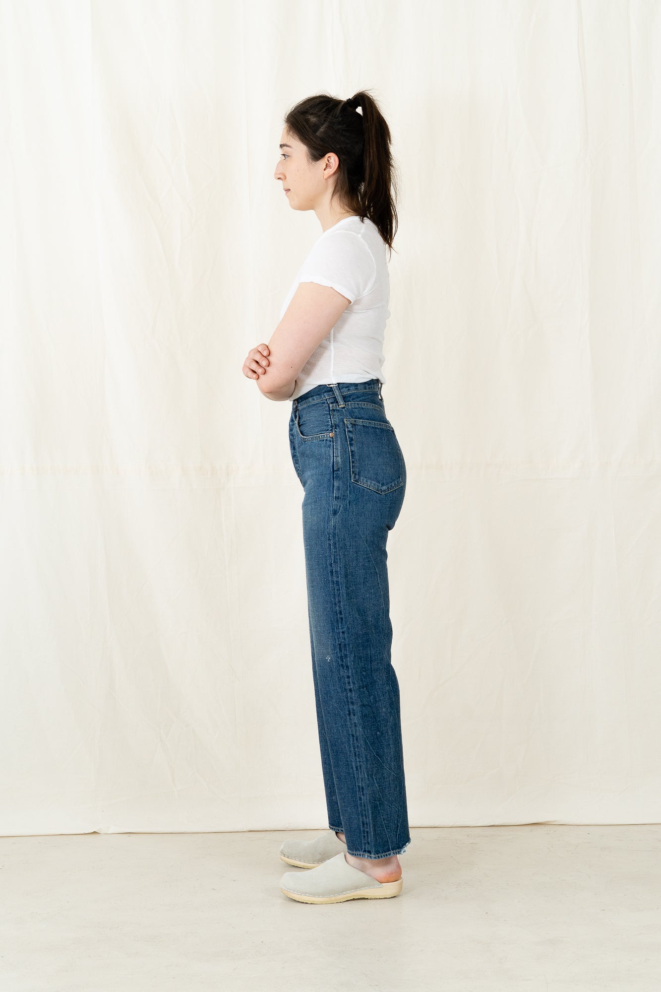 Chimala 13.5oz selvedge straight cut in a used medium wash for men — and women.