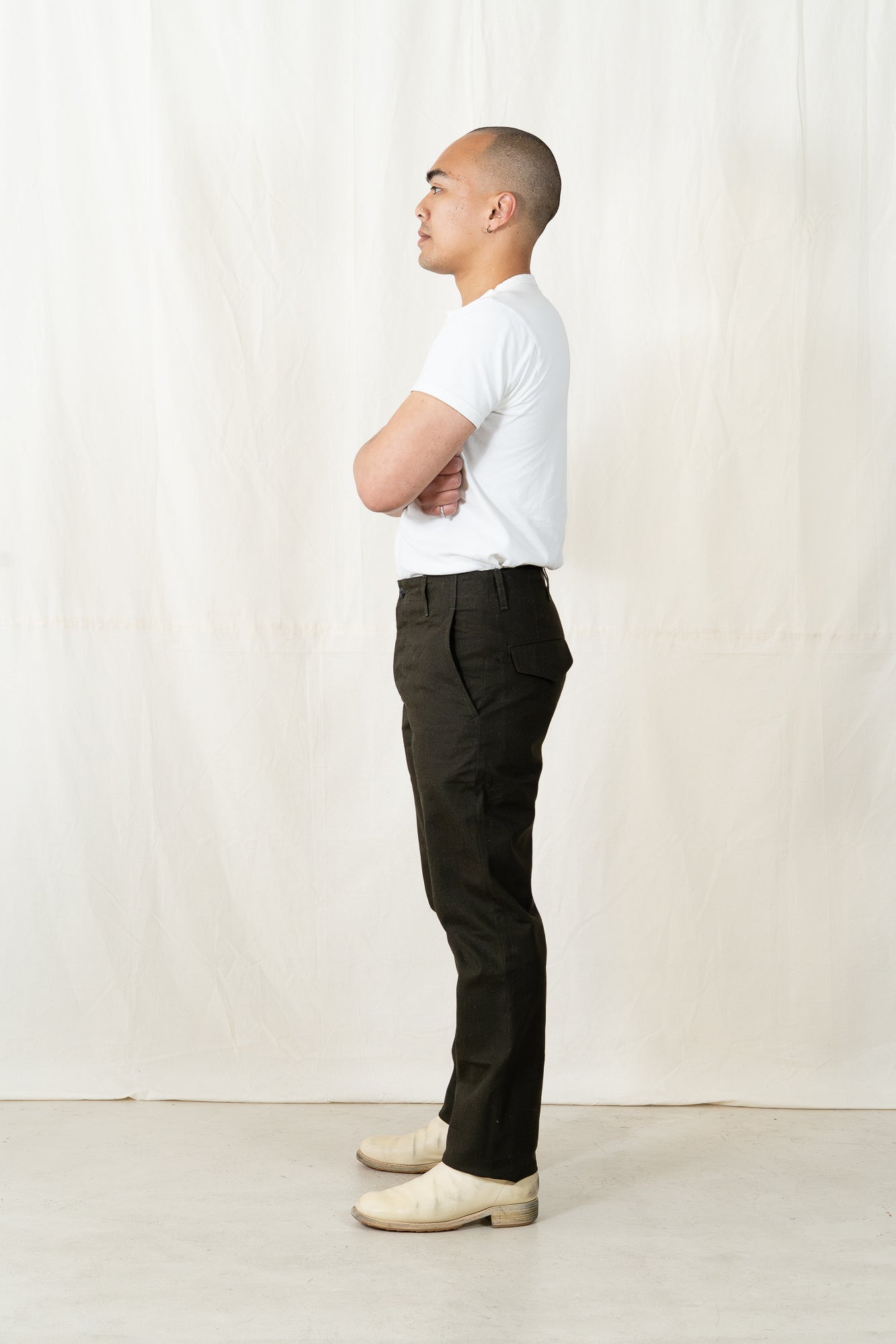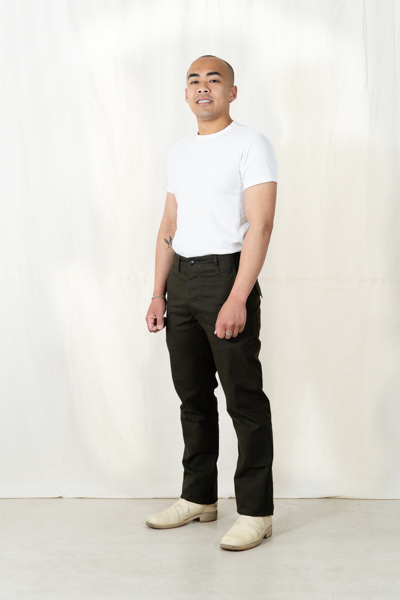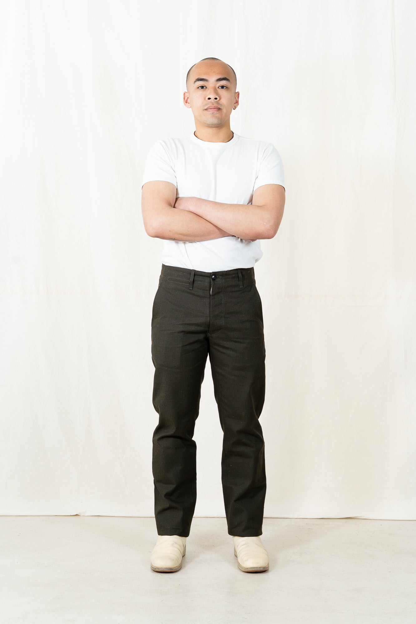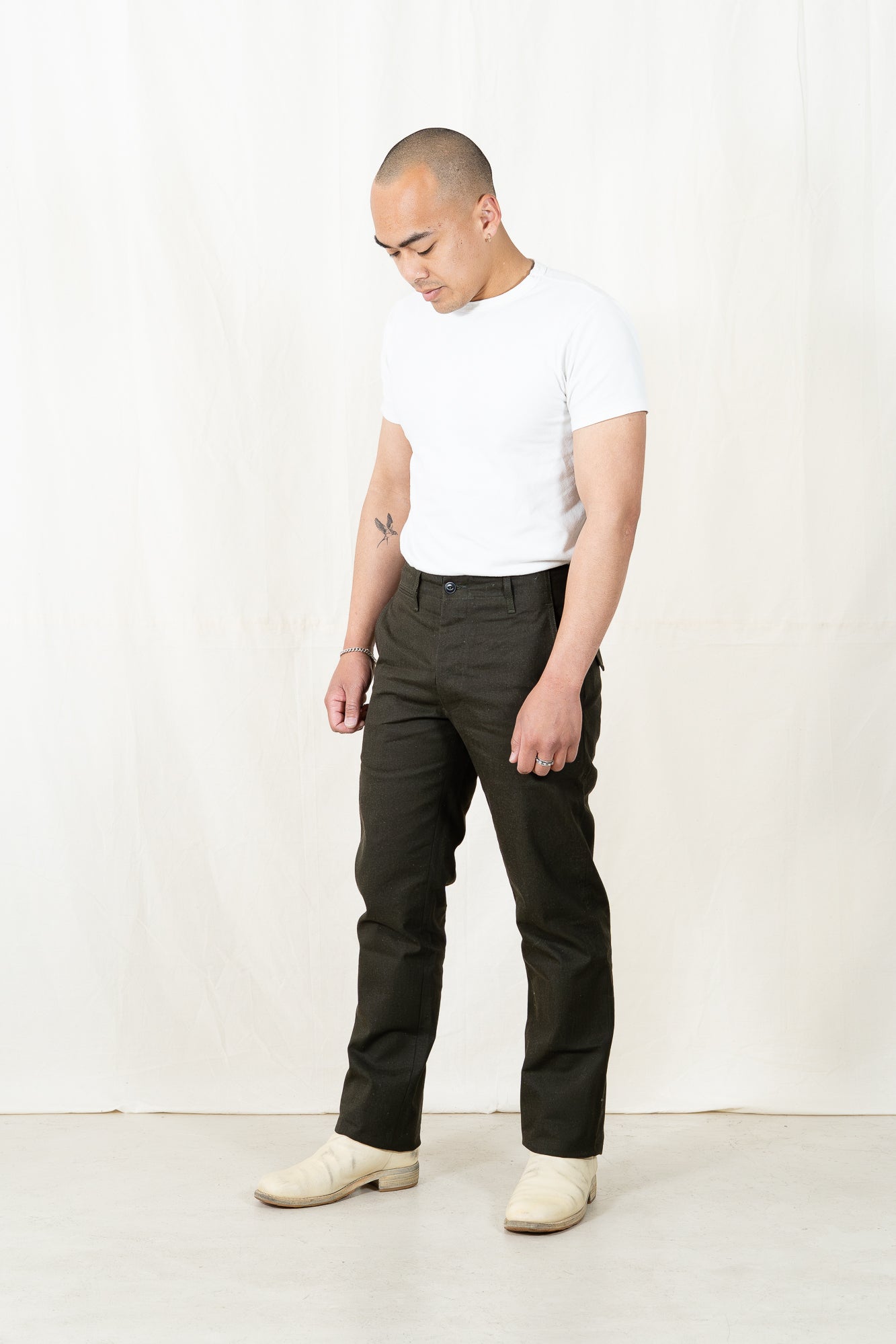 Blue Blanket's classic trouser is their strongest reference to the military world due to the color of the fabric, fit, and details. The trousers belt is finished with a 100% cotton italian raw fabric. The trousers have a sartorial belt construction. All the buttons are fisheye buttons in real corozo. Buttons for suspenders inserted internally in the trousers belt.