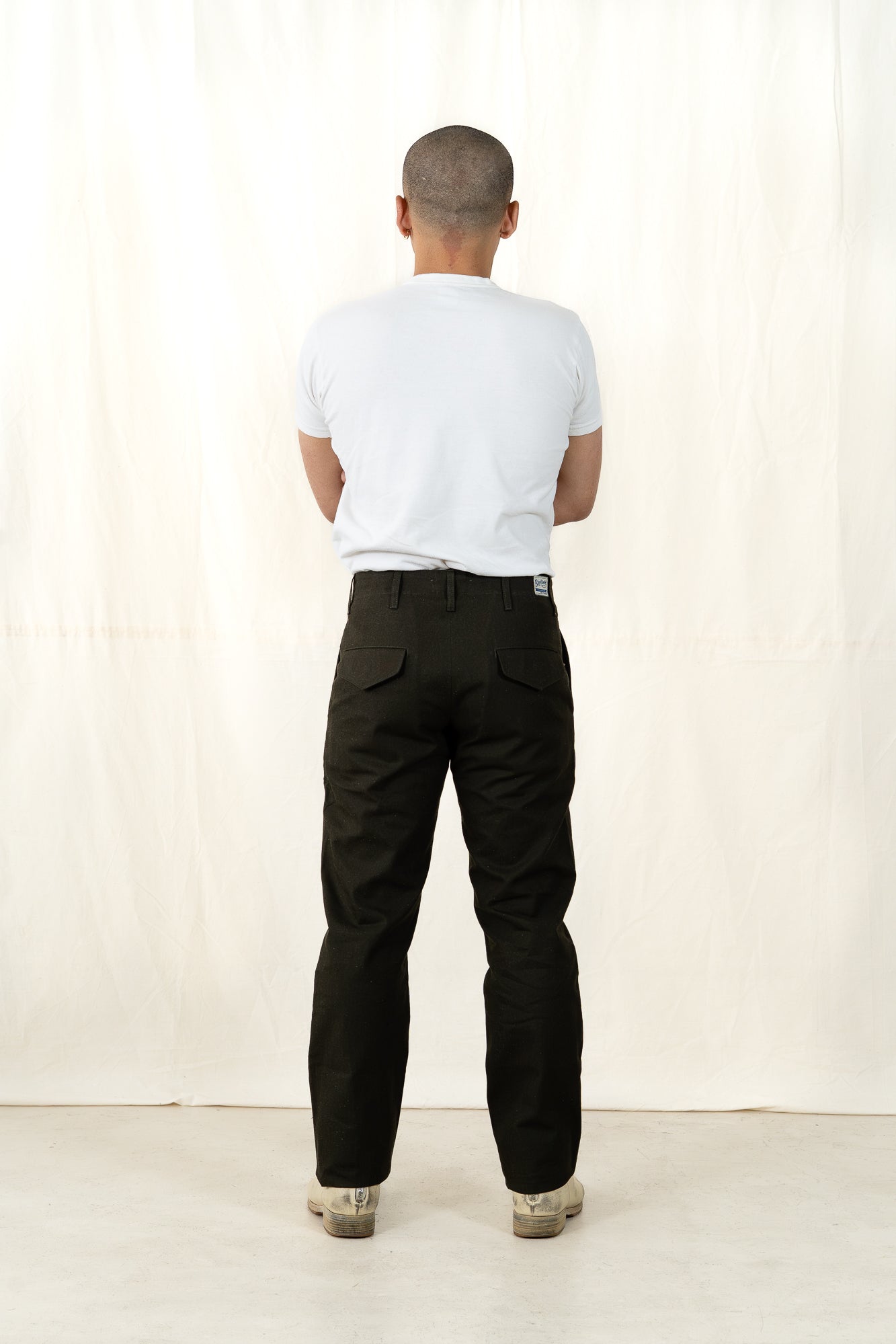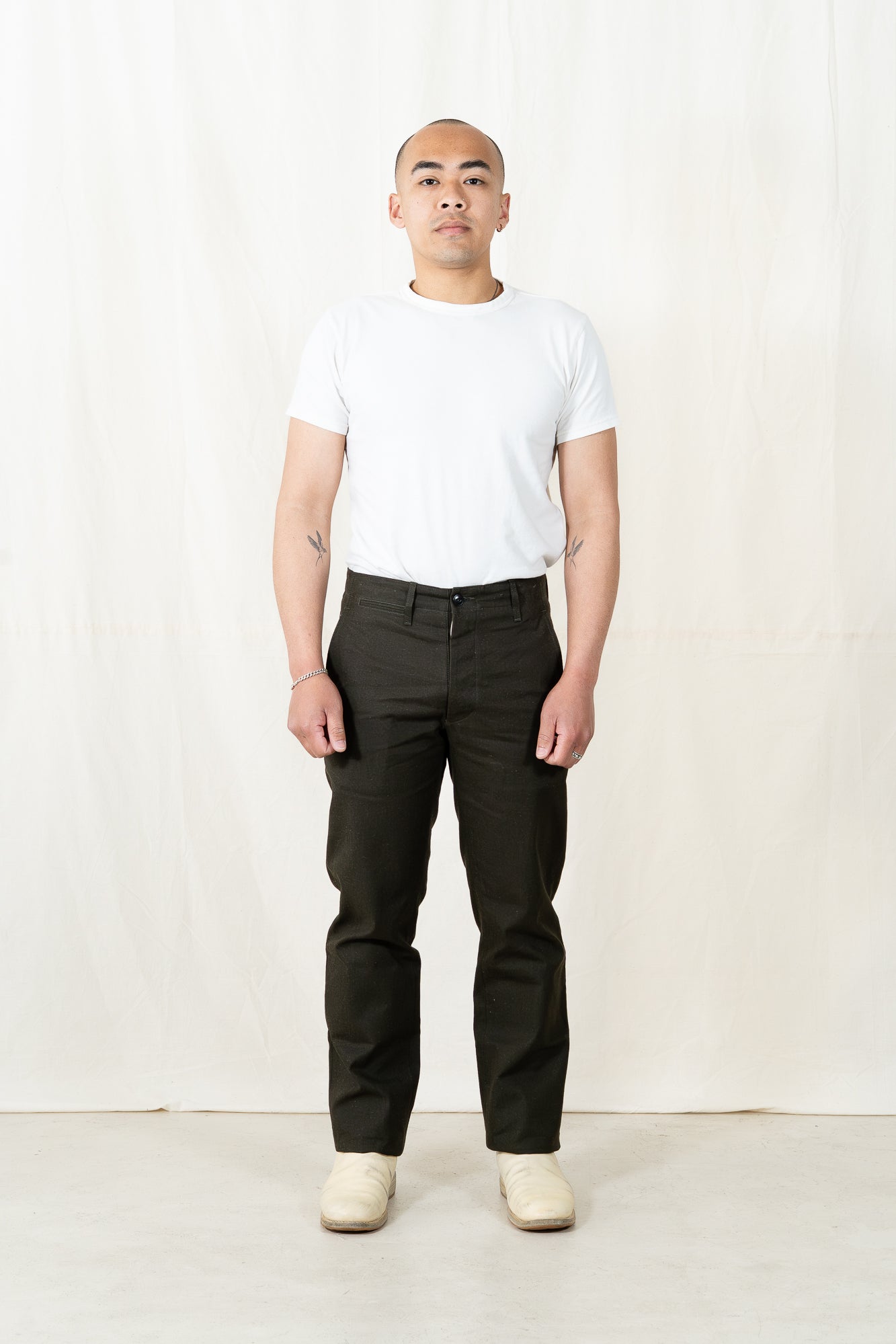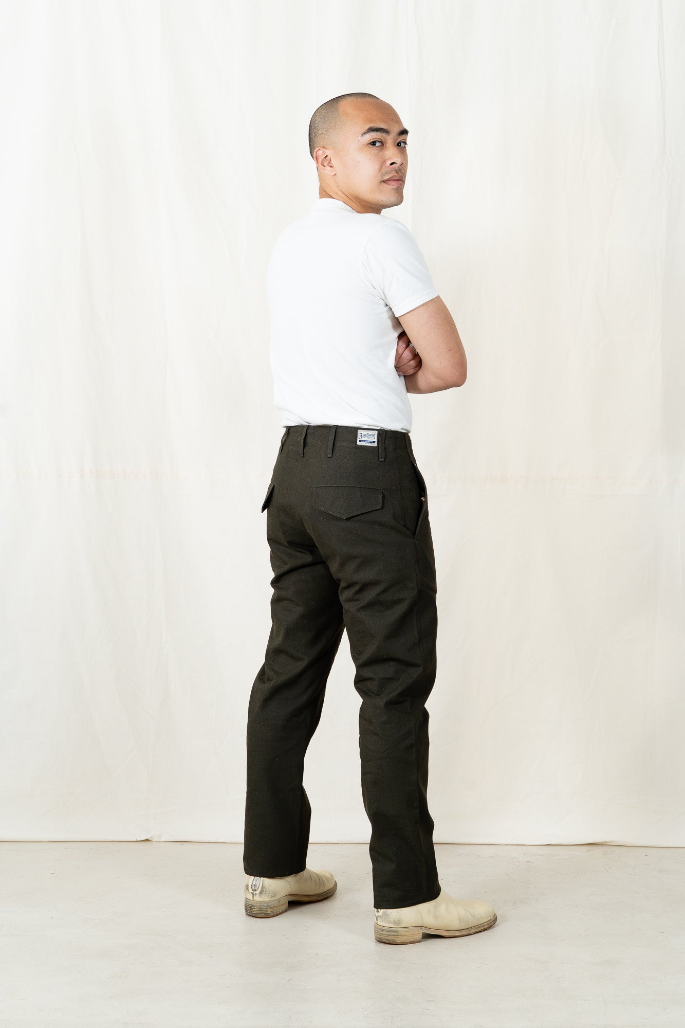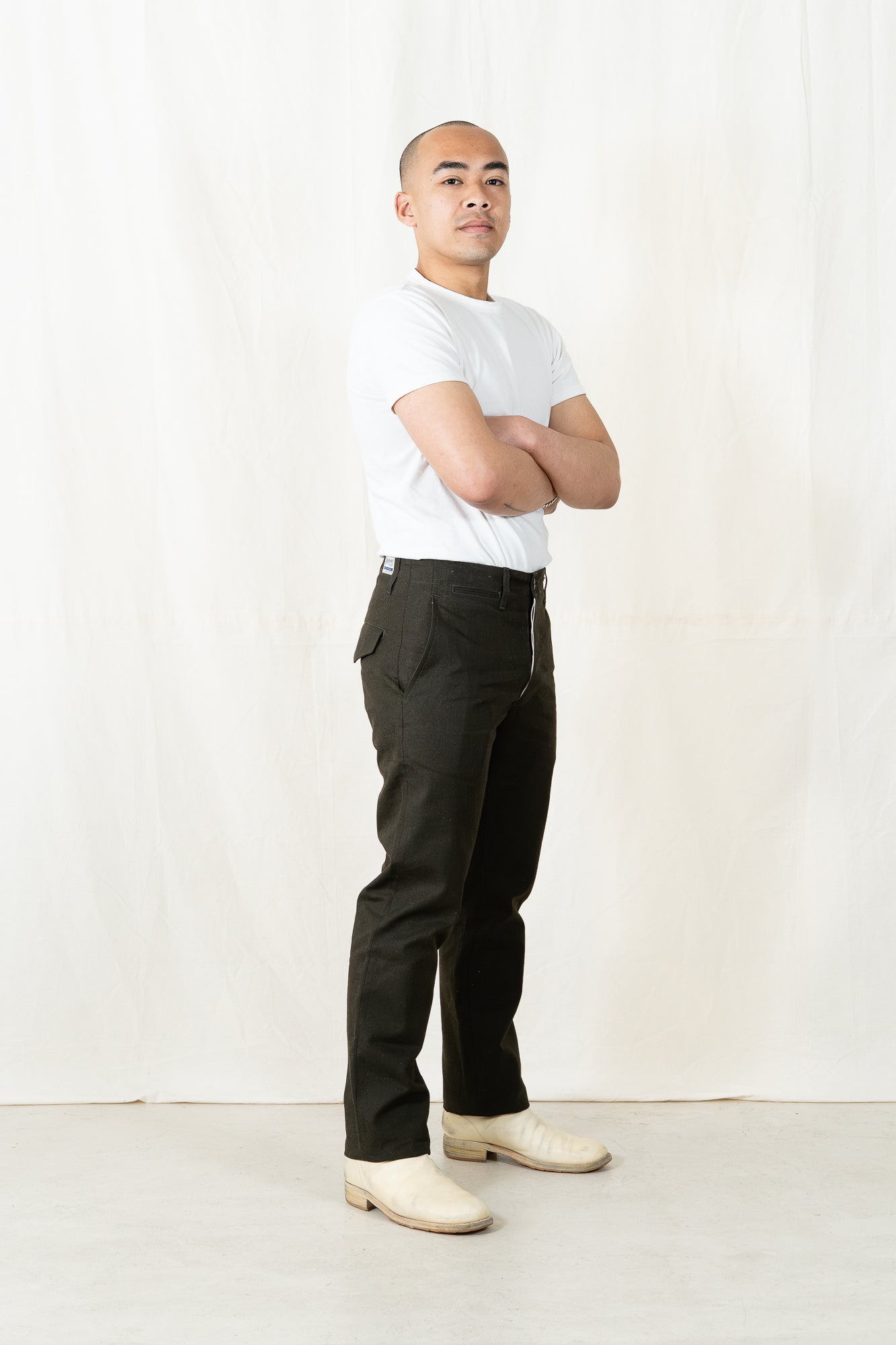 Blue Blanket's classic trouser is their strongest reference to the military world due to the color of the fabric, fit, and details. The trousers belt is finished with a 100% cotton italian raw fabric. The trousers have a sartorial belt construction. All the buttons are fisheye buttons in real corozo. Buttons for suspenders inserted internally in the trousers belt.