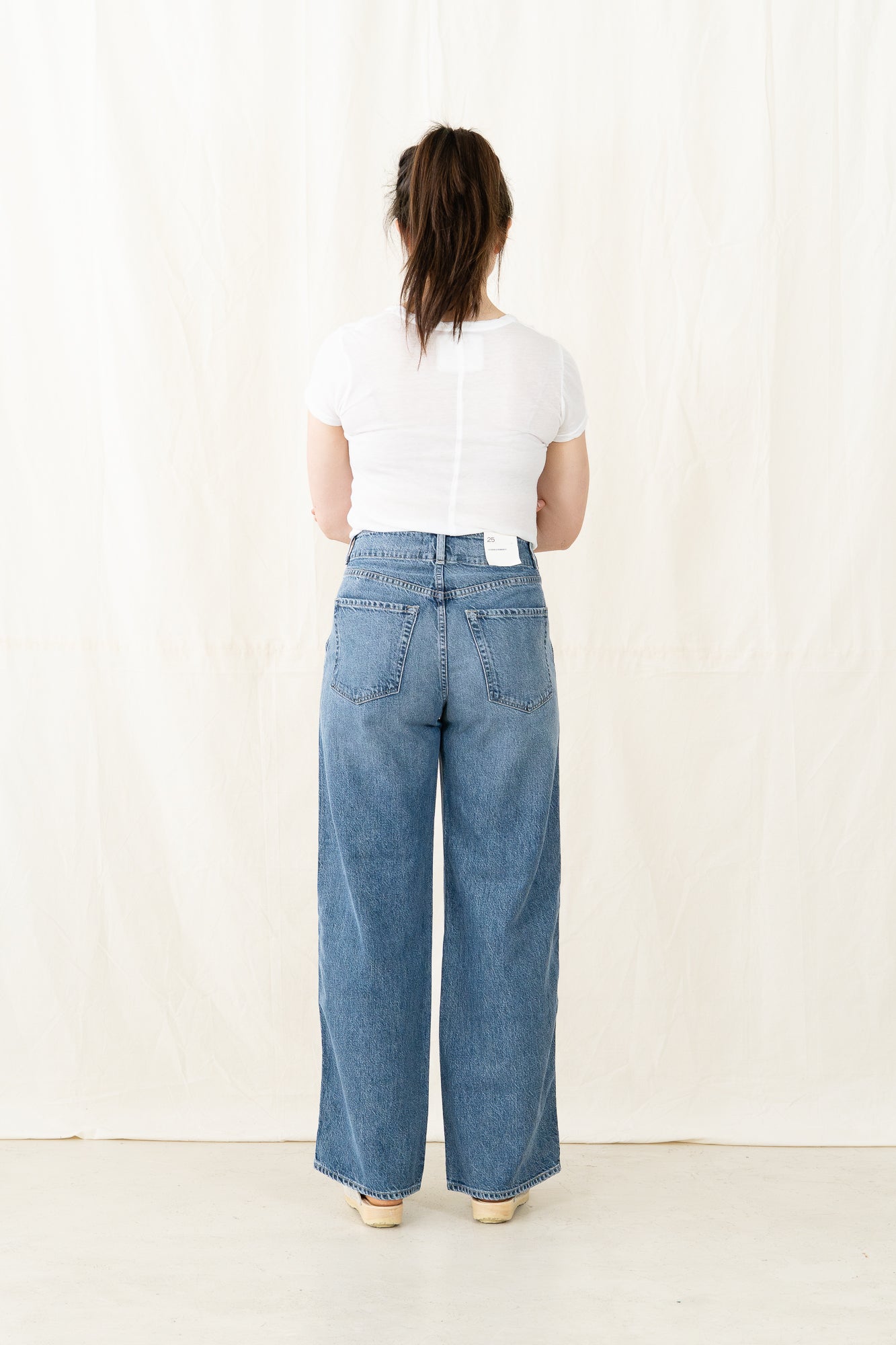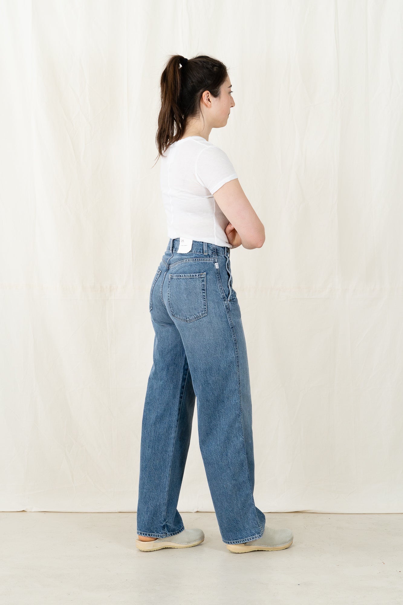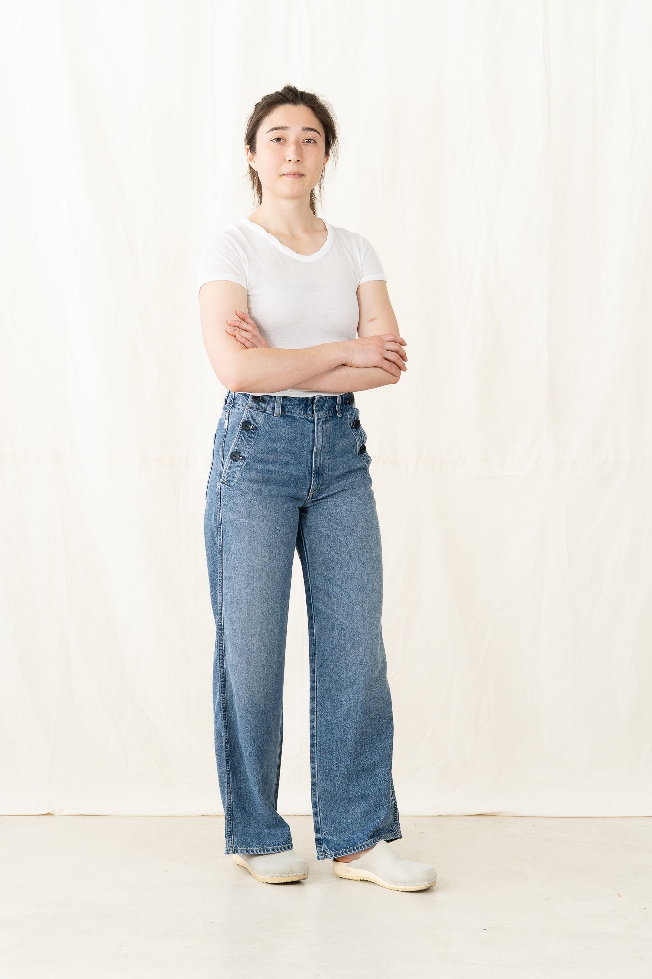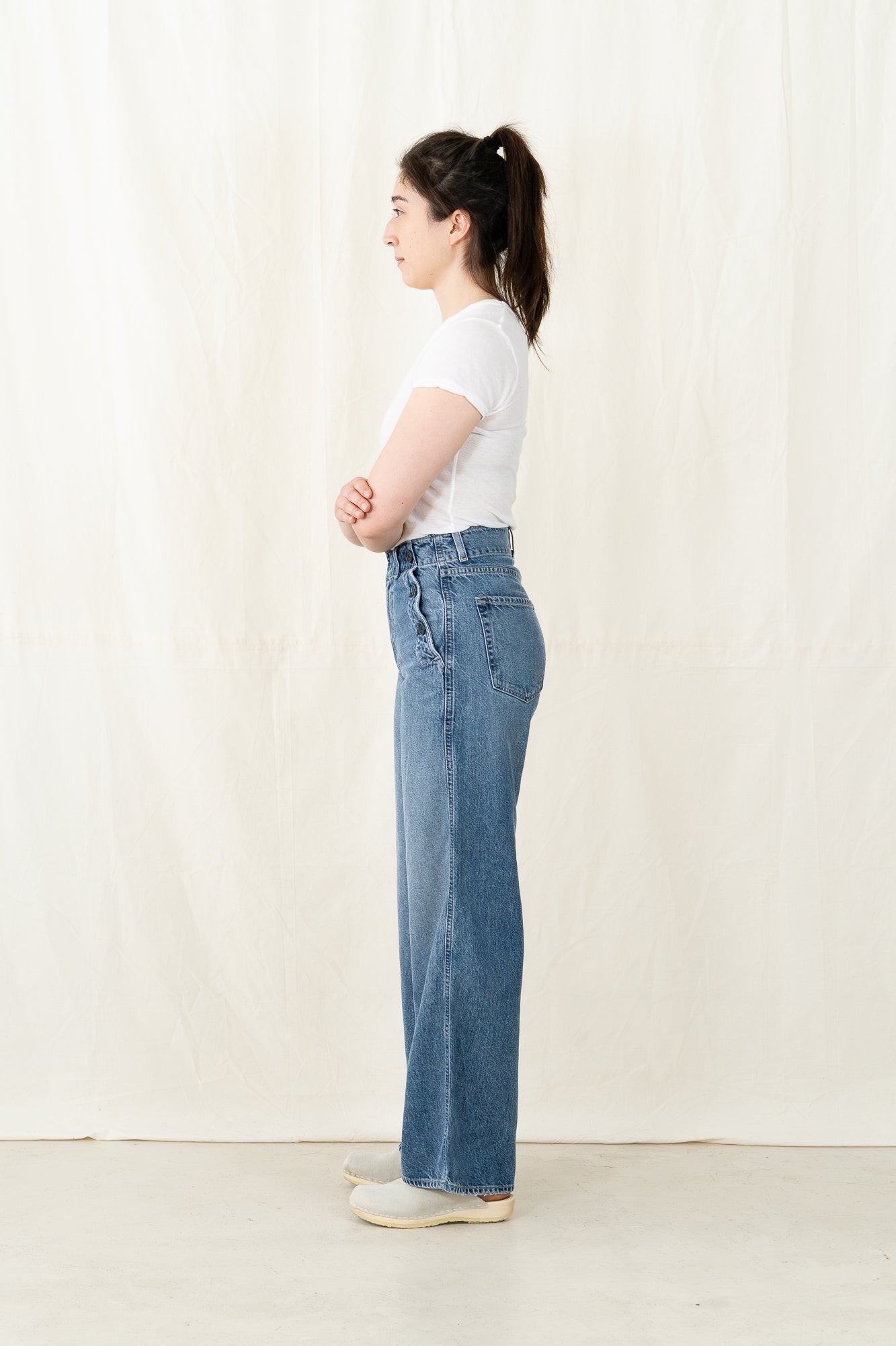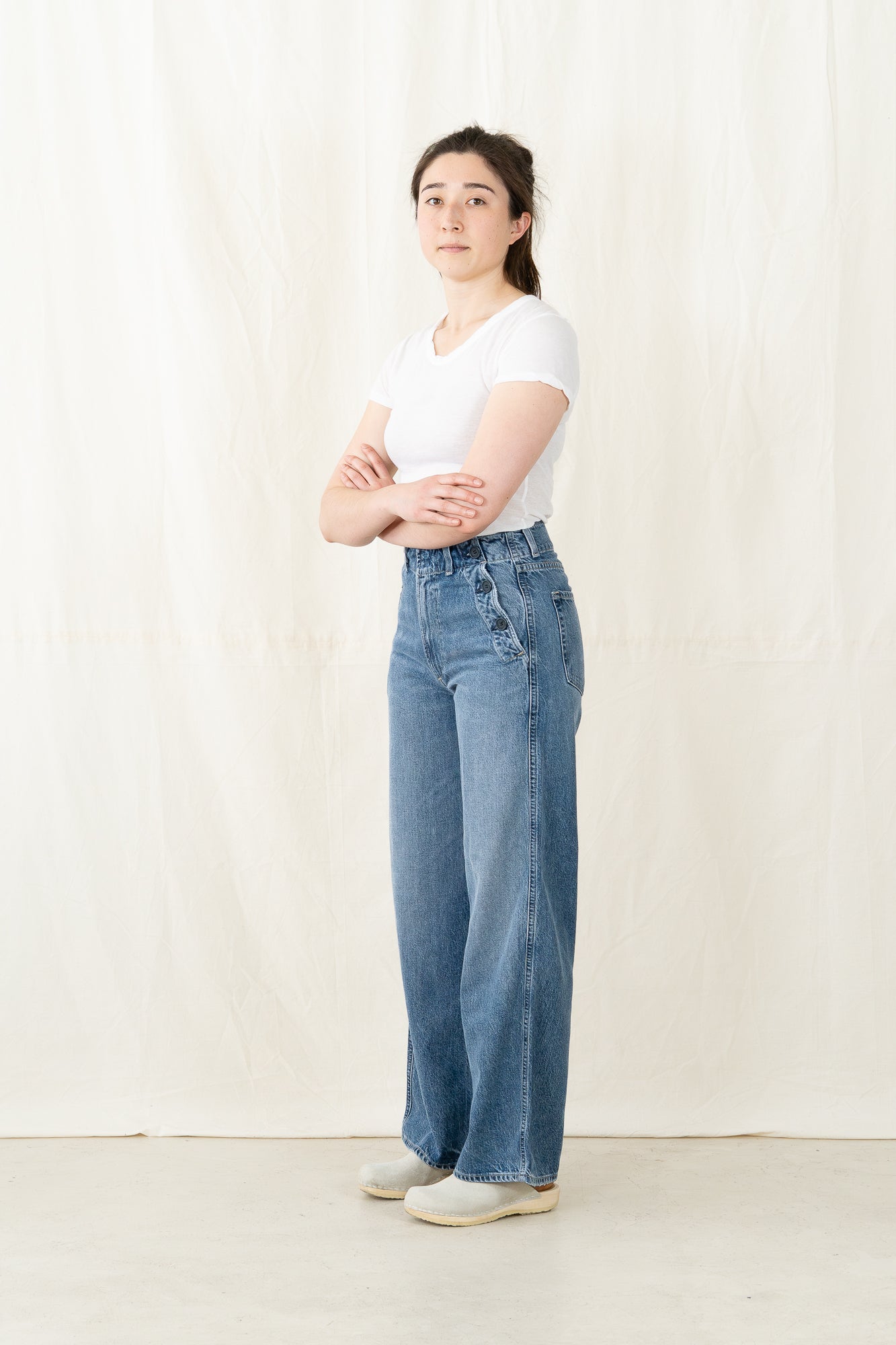 The Boardwalk Trouser draws inspiration from classic nautical styling with its signature button placement and sailor pant silhouette. The flowy, billowy leg offers an easy, relaxed fit that feels both effortless and sophisticated. Crafted from medium indigo denim, this piece is perfect for styling with tonal separates for a chic, monochromatic look that’s as elevated as it is laid-back. A versatile addition to any summer wardrobe.