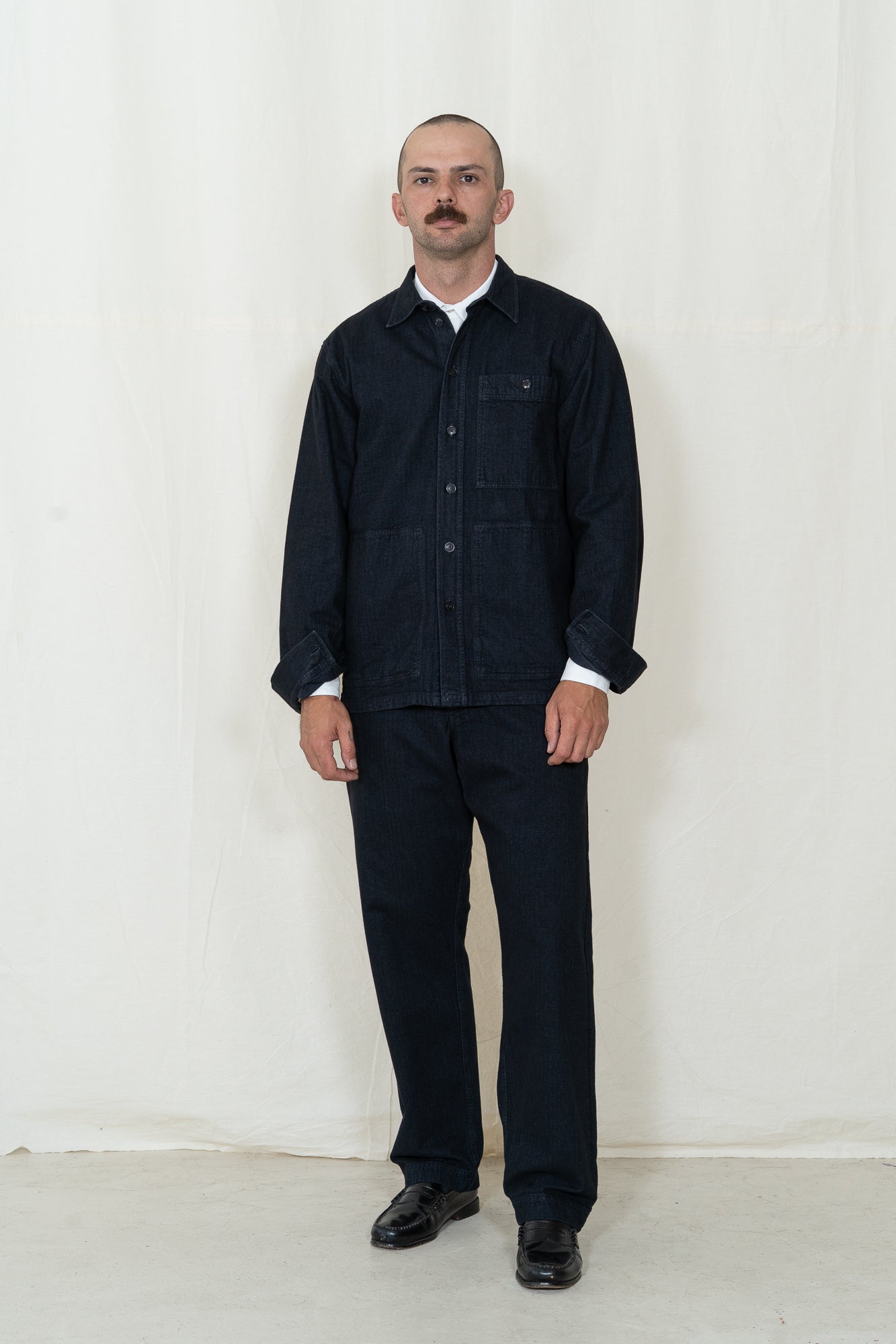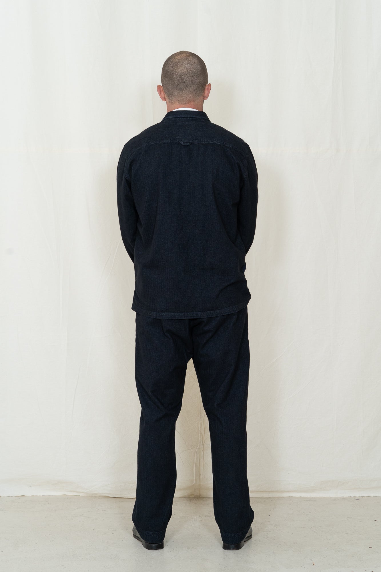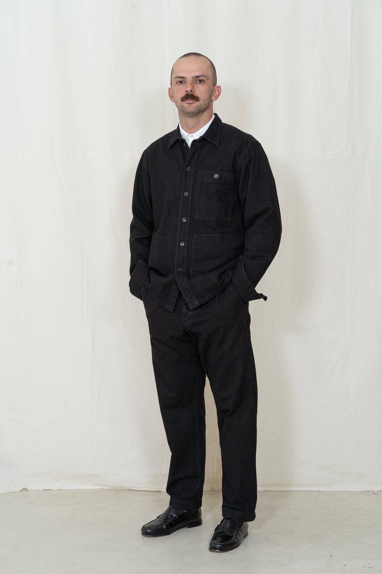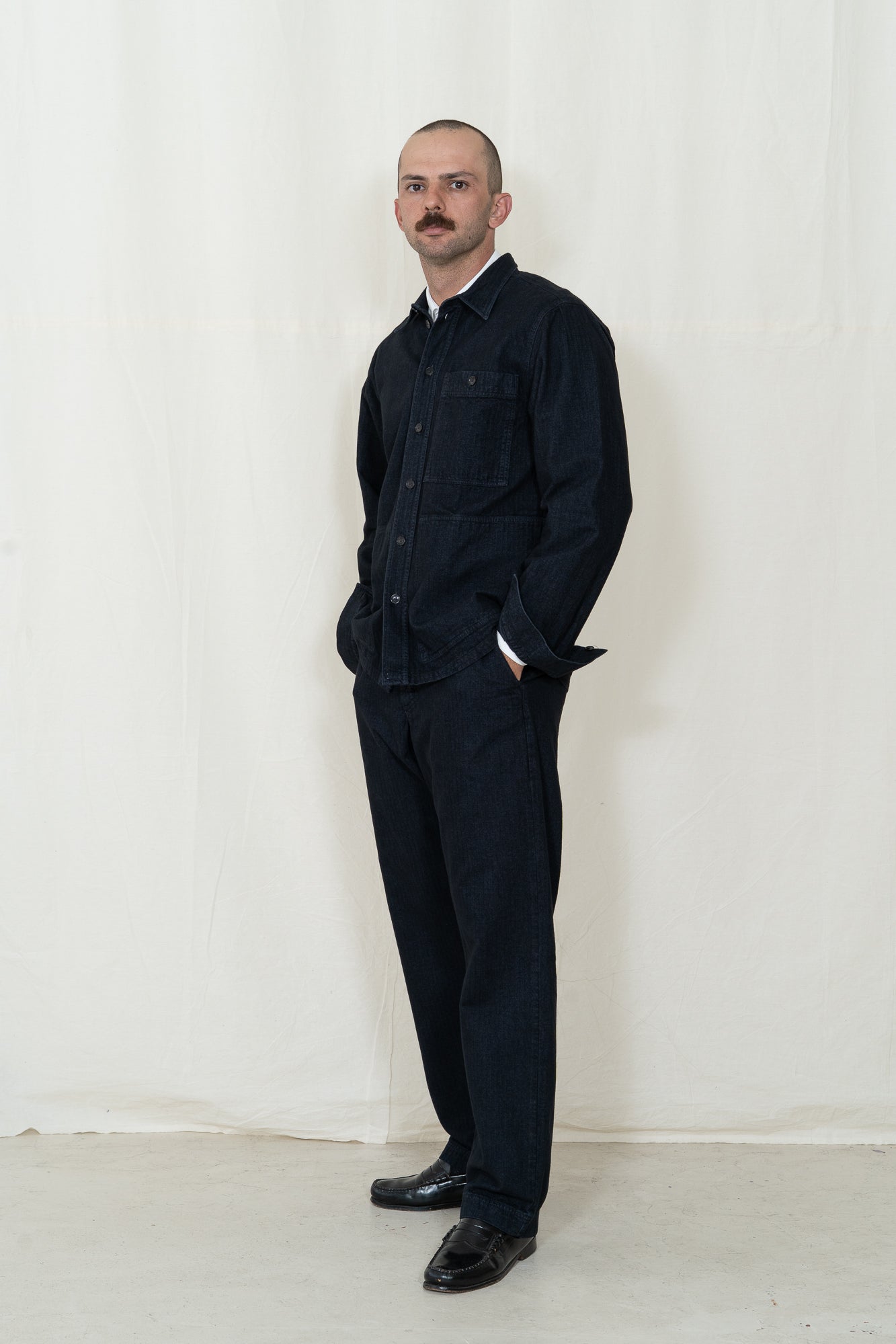 Hansen's overskirt for men is crafted from Italian cotton herringbone with a brushed finish for softness. It's over-dyed for a rich, textured look. This relaxed-fit overshirt features a buttoned chest pocket, two side-entry front pockets, corozo button front closure, and buttoned cuffs. A hanging loop at the back yoke adds a subtle utilitarian detail.