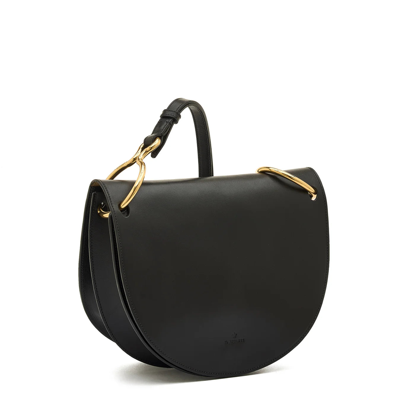 Women's bag in vegetable-tanned cowhide leather with large brass rings, flap and adjustable shoulder strap. Can be worn cross-body or over the shoulder, strap has brass studs to adjust the length. Under-flap closure with magnetic snap. Accordion-style opening. The interior, lined in suede, contains a double open pocket for credit cards and ID.