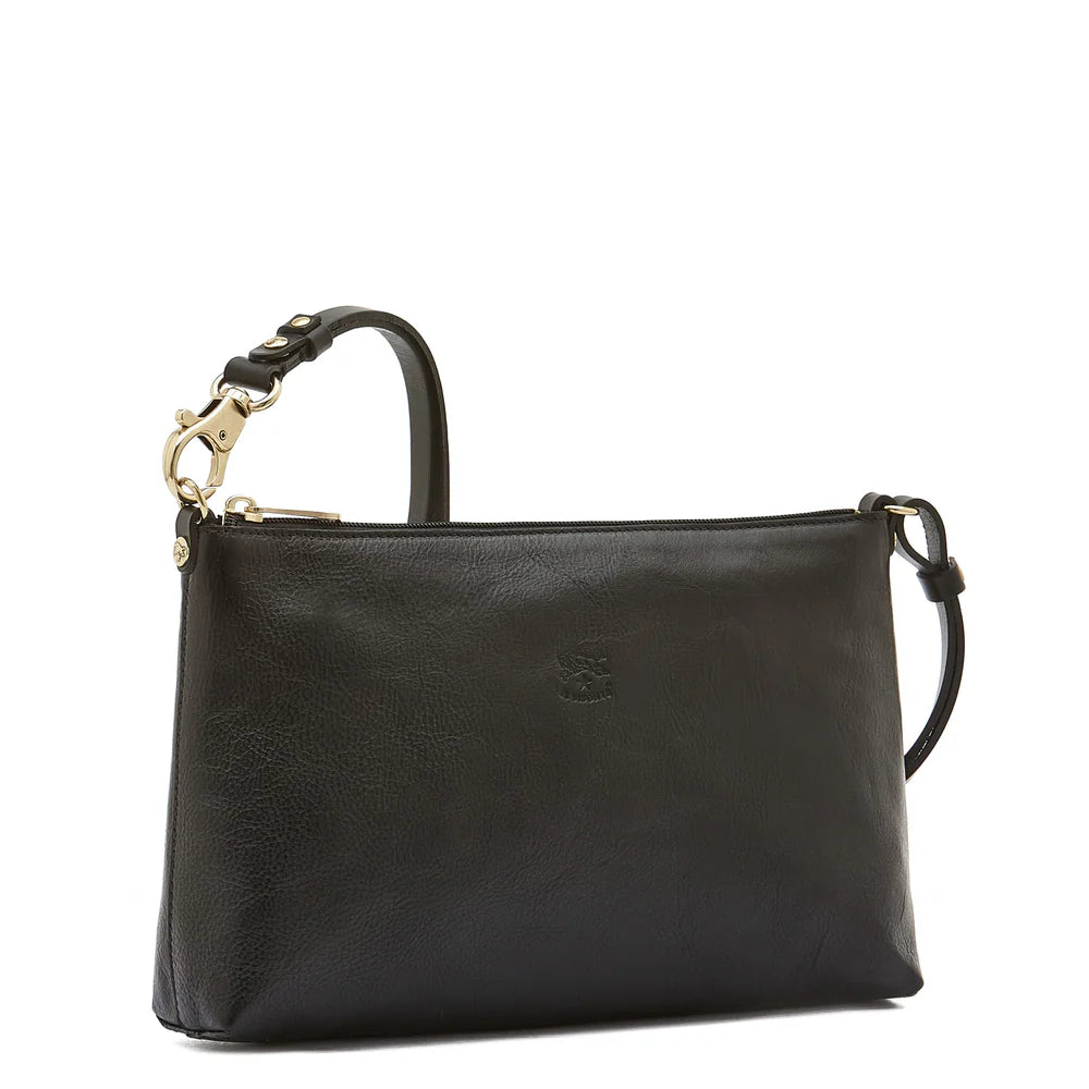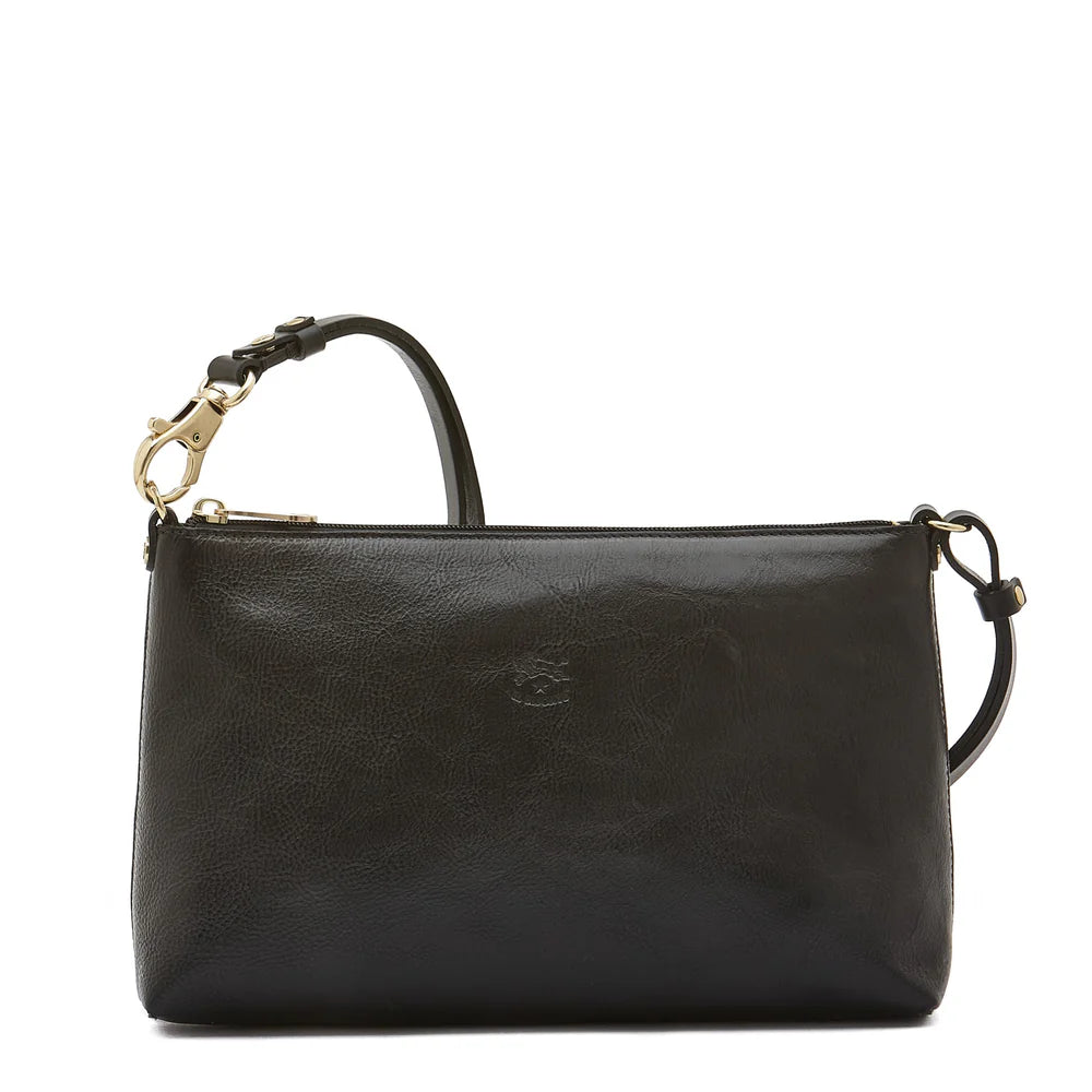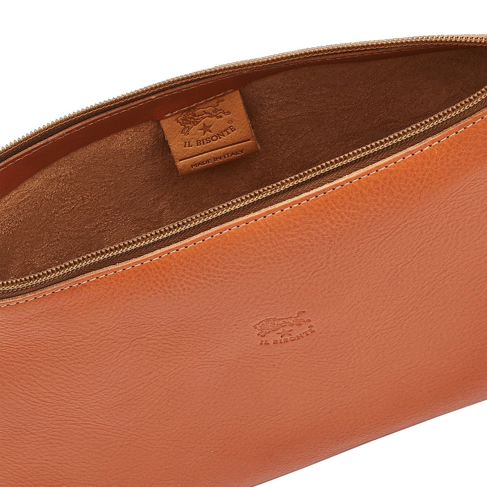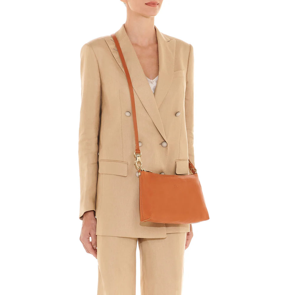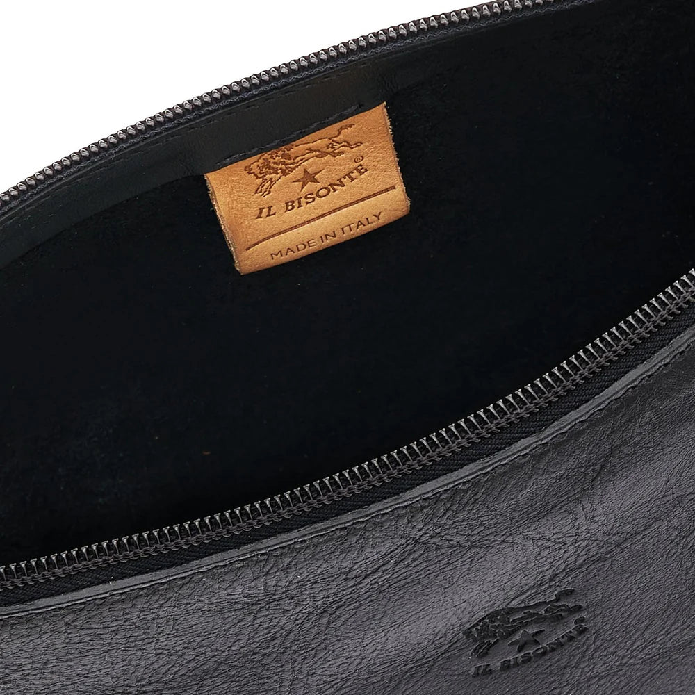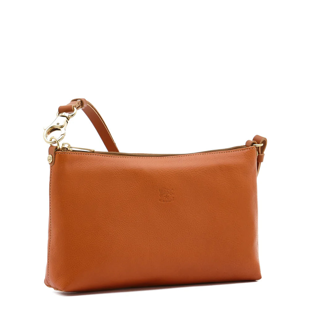 Women's shoulder bag in vegetable-tanned cowhide leather with adjustable shoulder strap. Made in Italy by master artisans in Il Bisonte’s 30 km supply chain.Shoulder strap attached with a snap hook and gold-finish brass ring. The length of the shoulder strap can be adjusted with the snap button. Zip closure with brass pull. Unlined.
