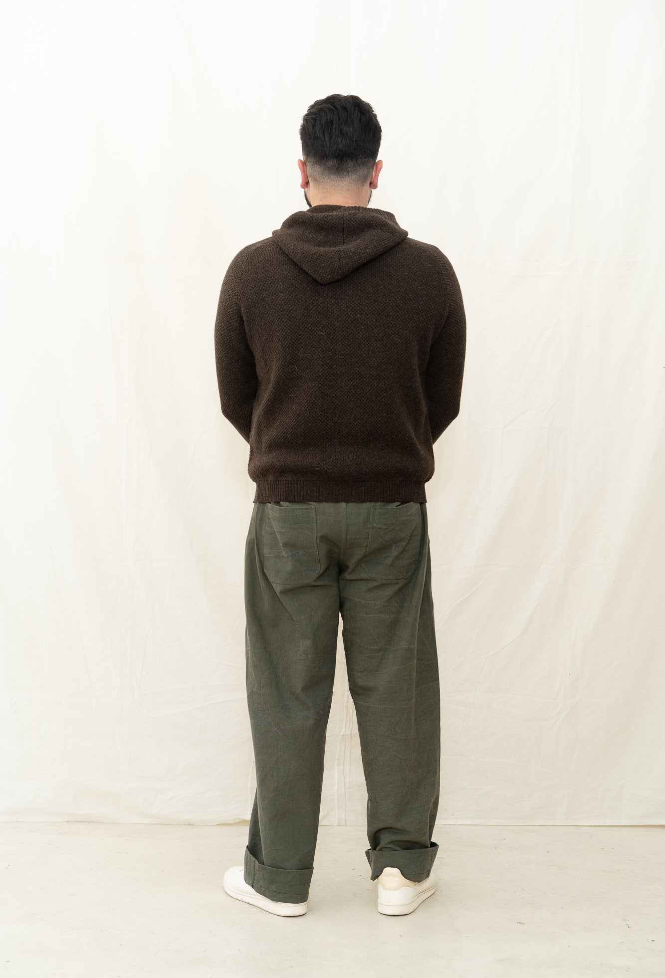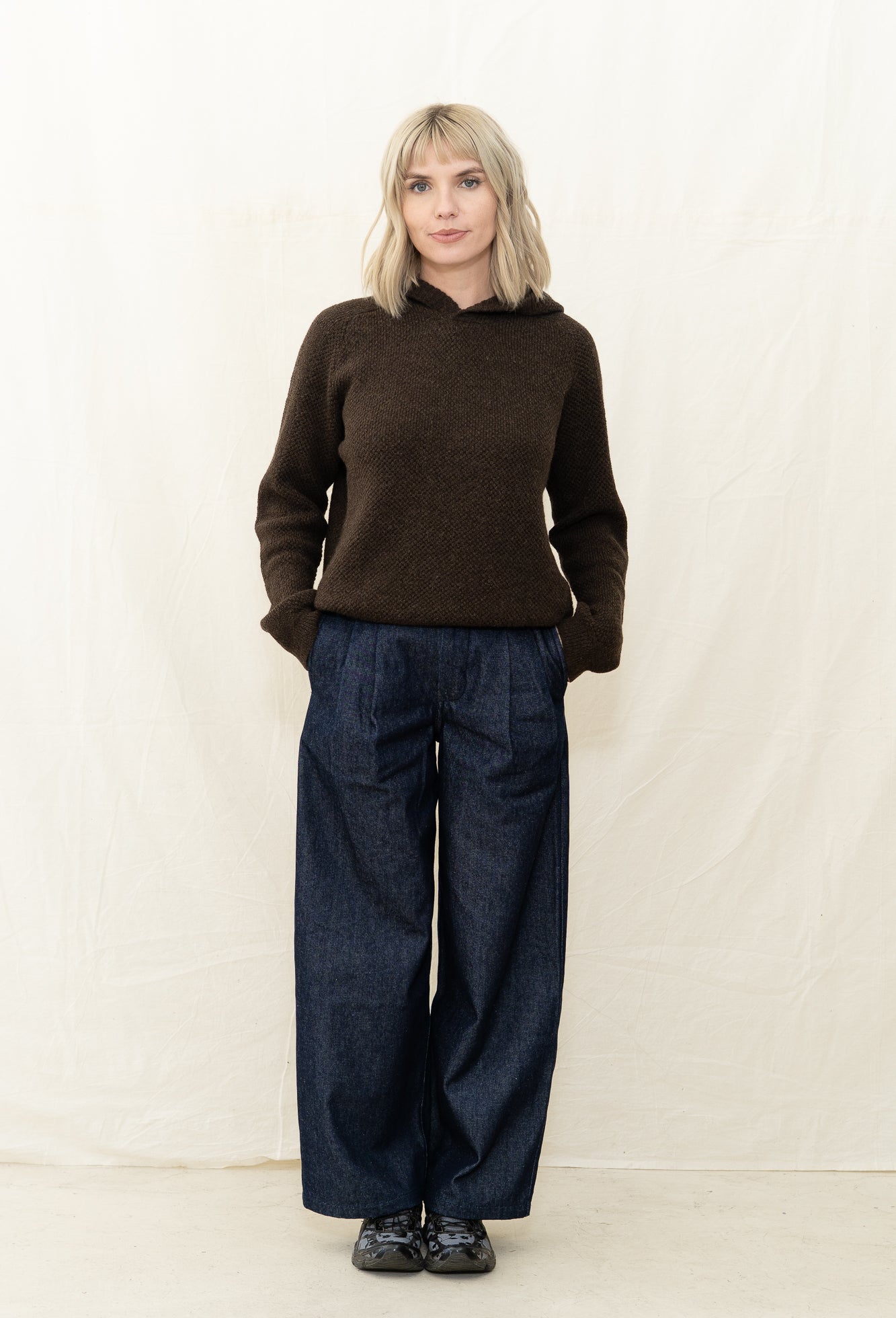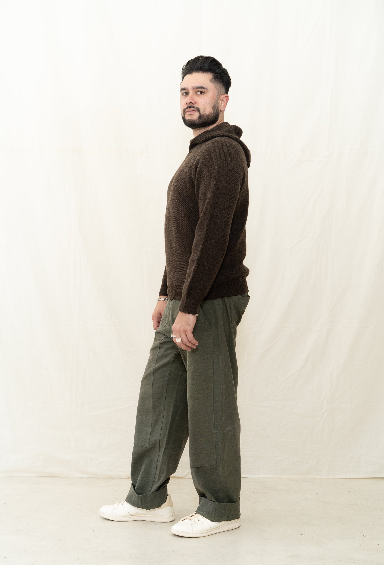 INDI + ASH Santi Hoody for men and women has all the great details of a vintage Swiss military thermal. Knit in a fine gauge from superfine undyed alpaca, with a waffle stitch at the body and a saddle raglan and rib that travels across the back yoke and down the sleeve to the cuff. It is can be worn on its own, or layered under a shirts or jacket.