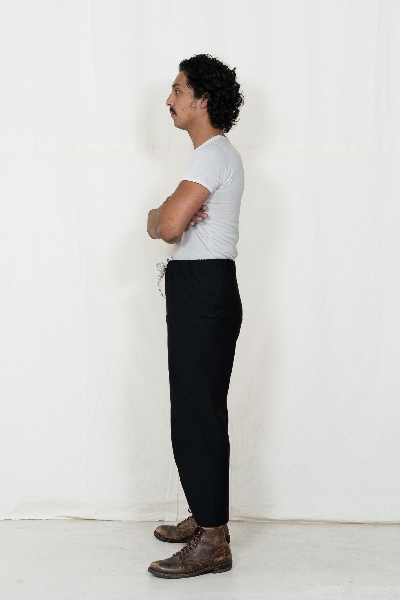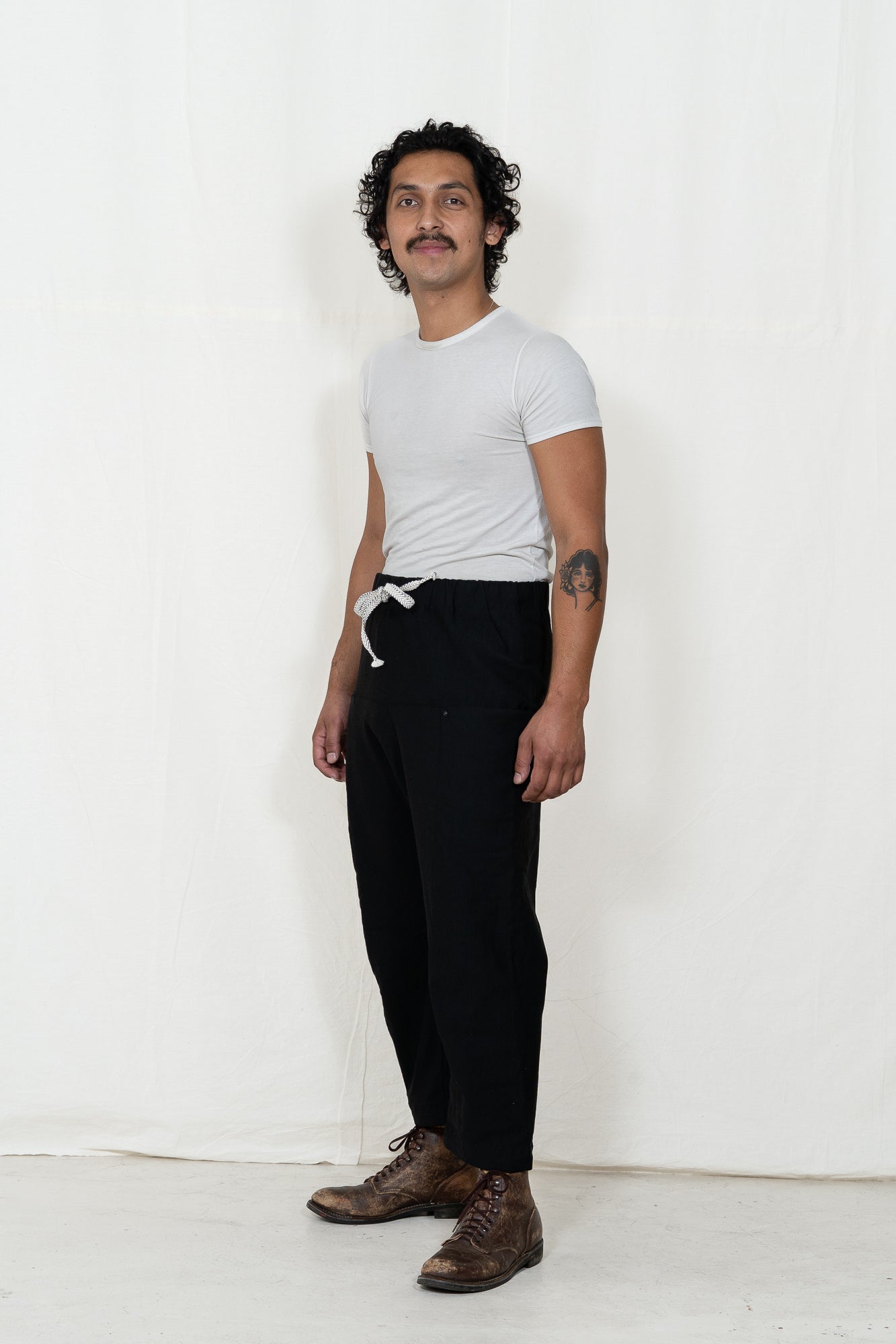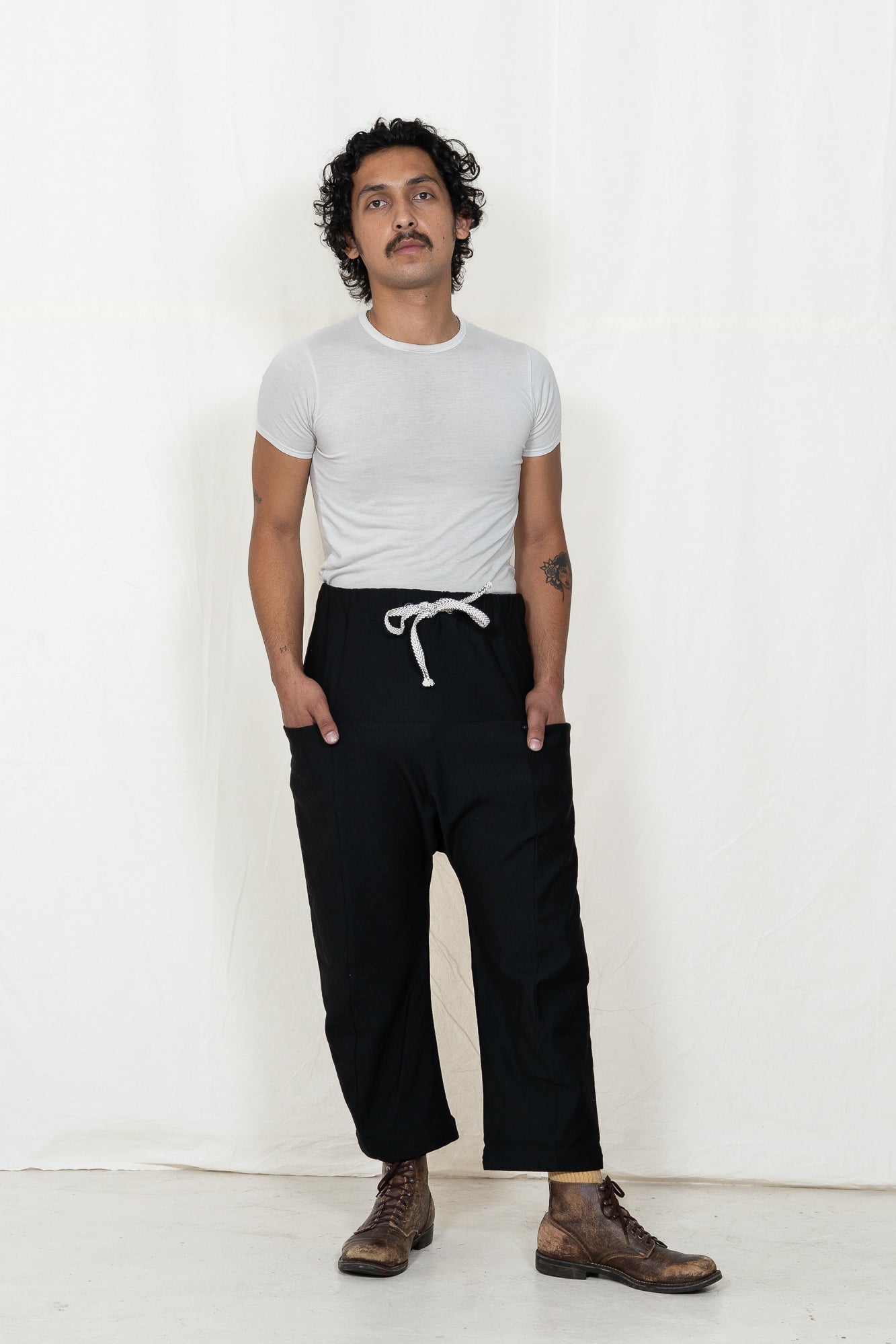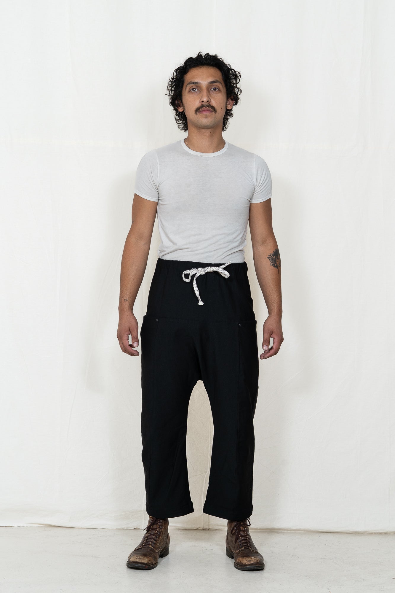 MATiAS' most infamous signature trouser for men. Unbelievably comfortable yet super luxurious. Originally modeled after an Indonesian elephant riding pant, Matias updated the silhouette for the 21st century. It is super wide and results in a very relaxed fit. It features an elastic waistband and drawcord closure, together with pockets that are built into the seam for utility and avant-garde stying. Totally Matias.