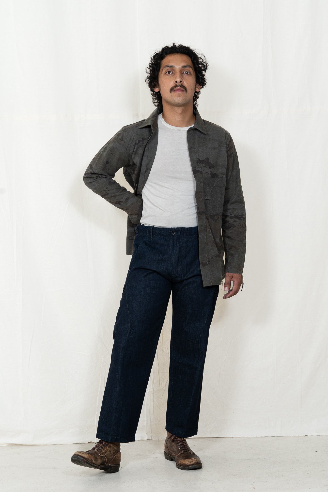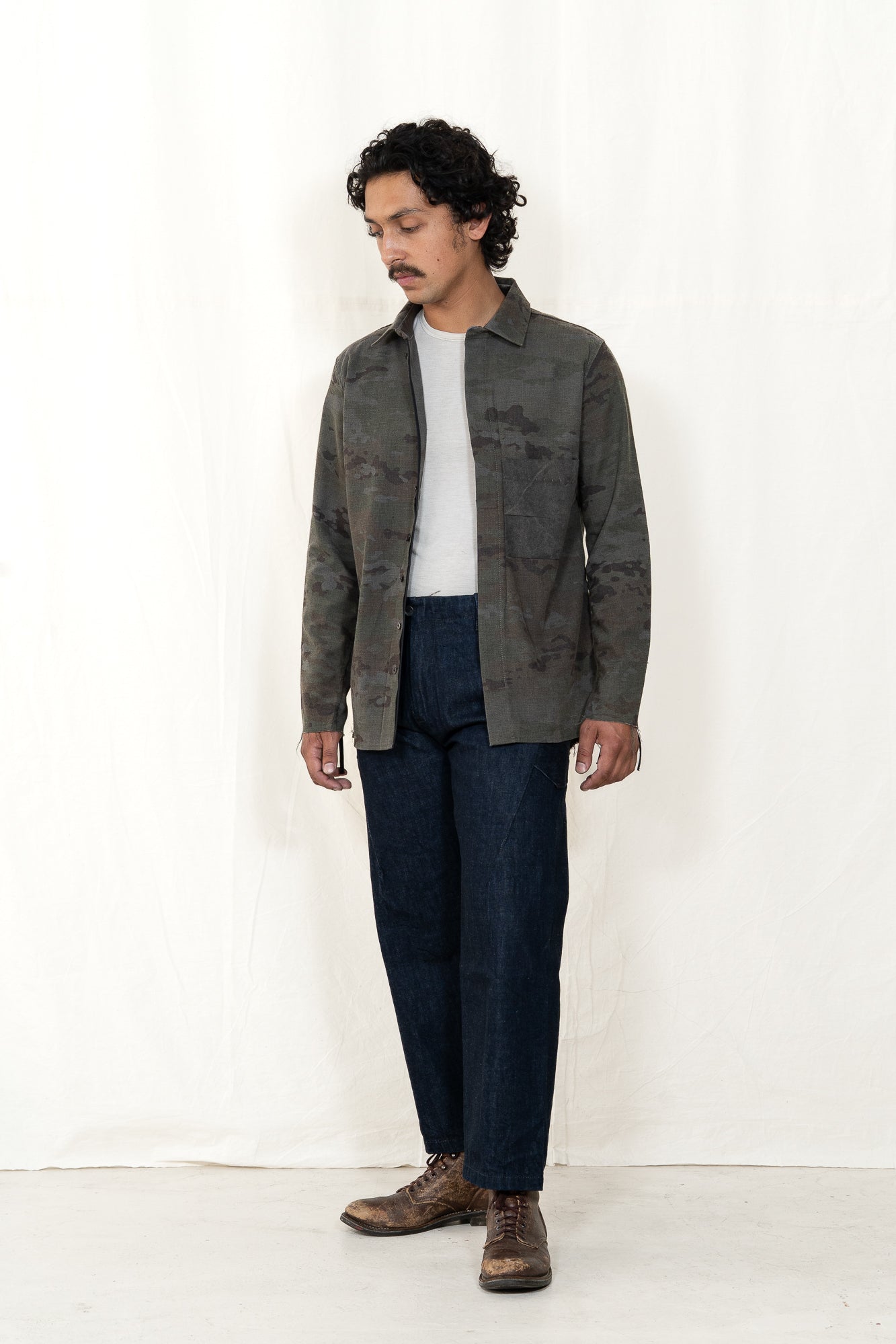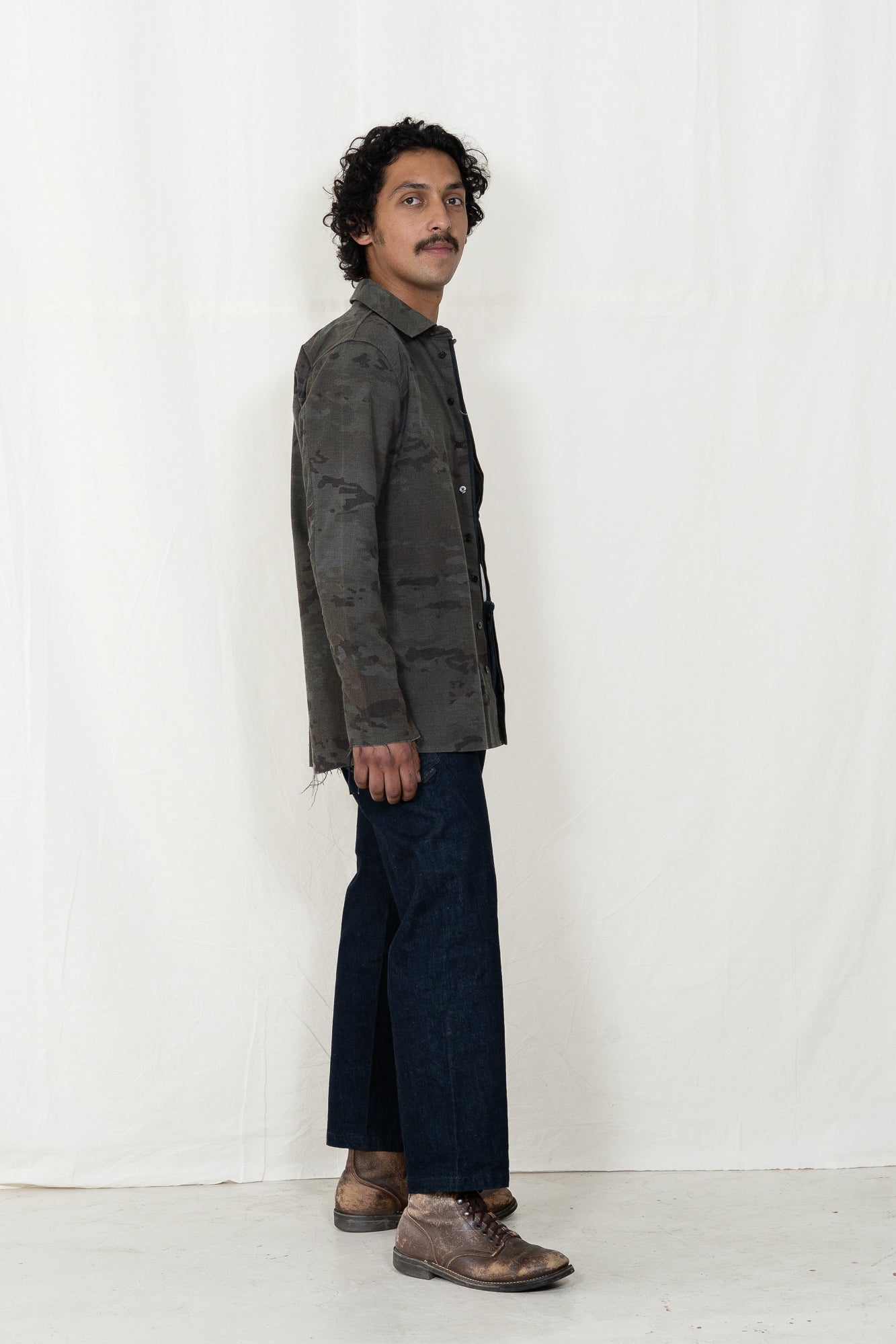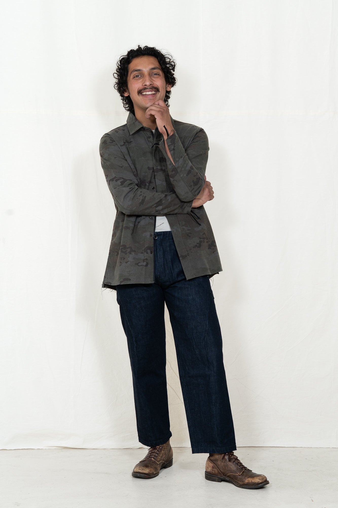 MATiAS's Rincon is a forward thinking hidden shirt for men. It has some very unique construction detailing throughout, including hidden buttons. It has a very sophisticated yet simple feel. Dueling fabrics and tailored details juxtapose well with the unfinished sleeve edges. This shirt can double as an over-shirt or an "LA Jacket". Totally Matias.