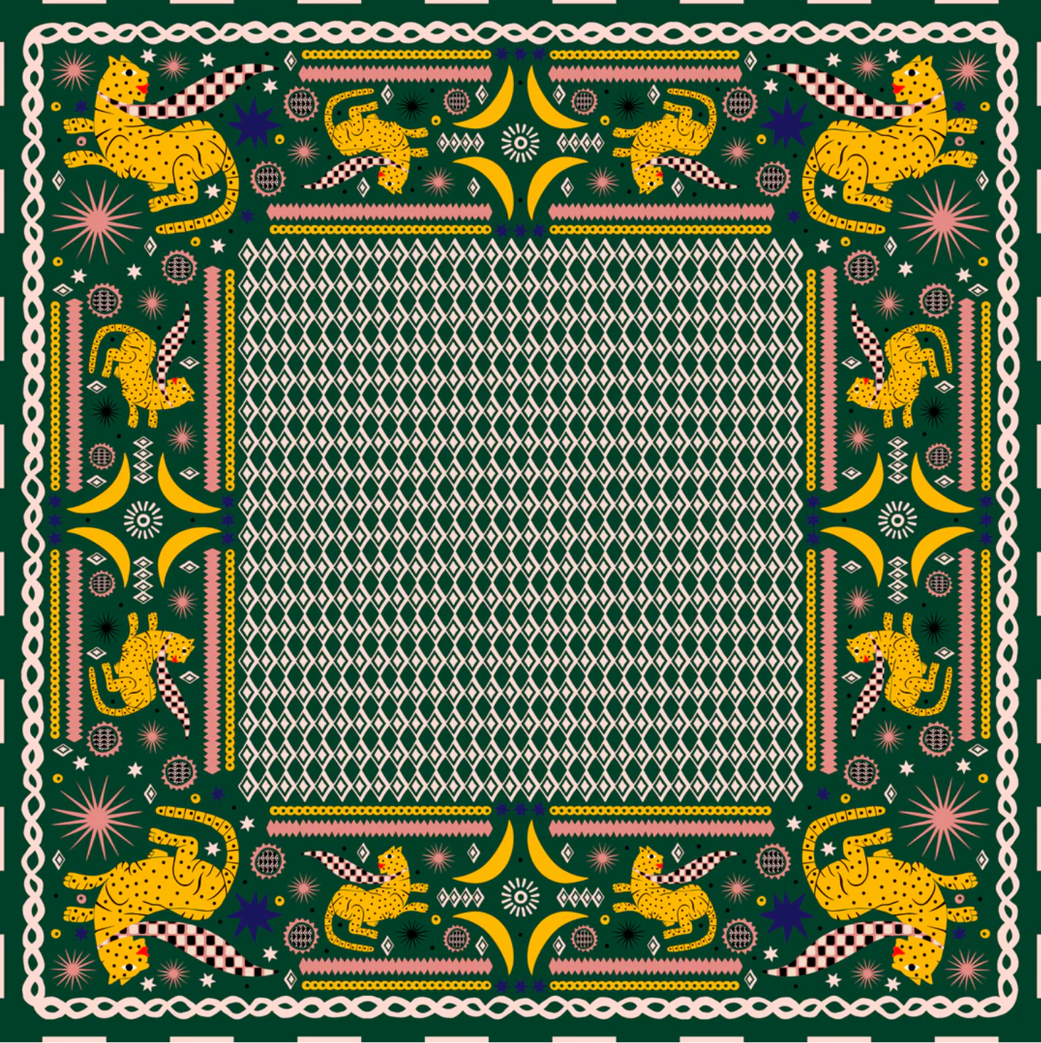 This design features the graceful yet powerful cheetah, one on each corner of the bandana, standing tall and vigilant, gazing ahead. The cheetah, known for its unmatched speed and agility, symbolizes bravery and determination. She is the protector, the one who moves with precision and purpose, always ready to stand strong when needed.