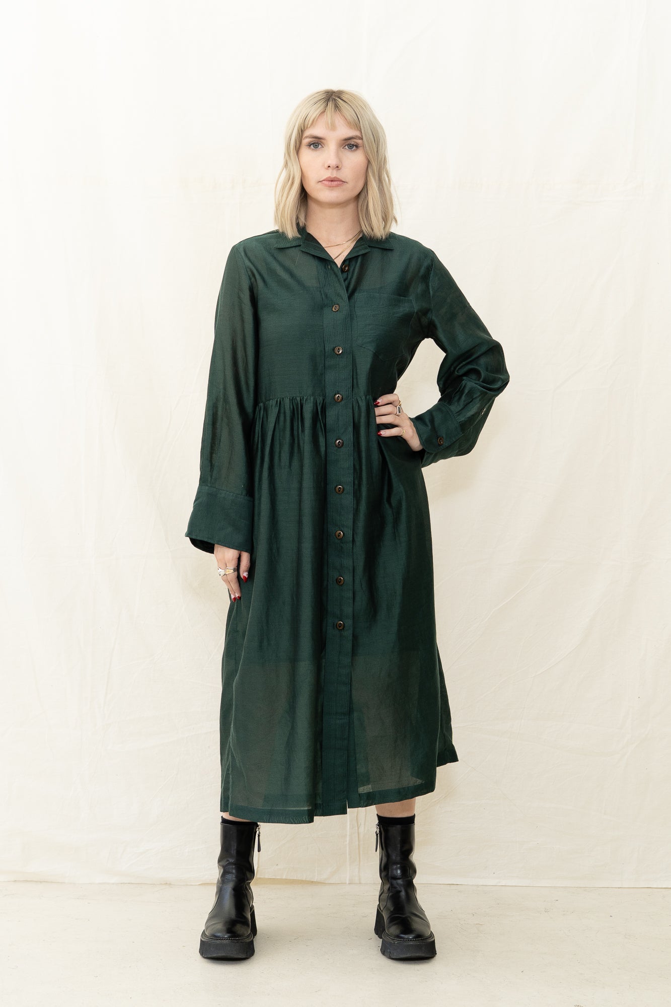 NYMANE Stockholm dress for women returns this season with long sleeves. An easy-to-wear camp shirt upper is matched with a shirred skirt, button front, and side-seam pockets. A fine stitch detail along the front placket and collar rounds out this exquisite piece. The silk and cotton fabric is handwoven silk cotton. It has a lustrous slight sheen to it and is slightly transparent. This dress comes with a slip dress in cotton voile, which is more fitted than outer shell.