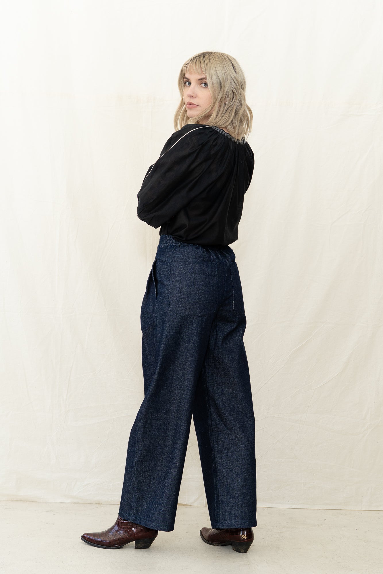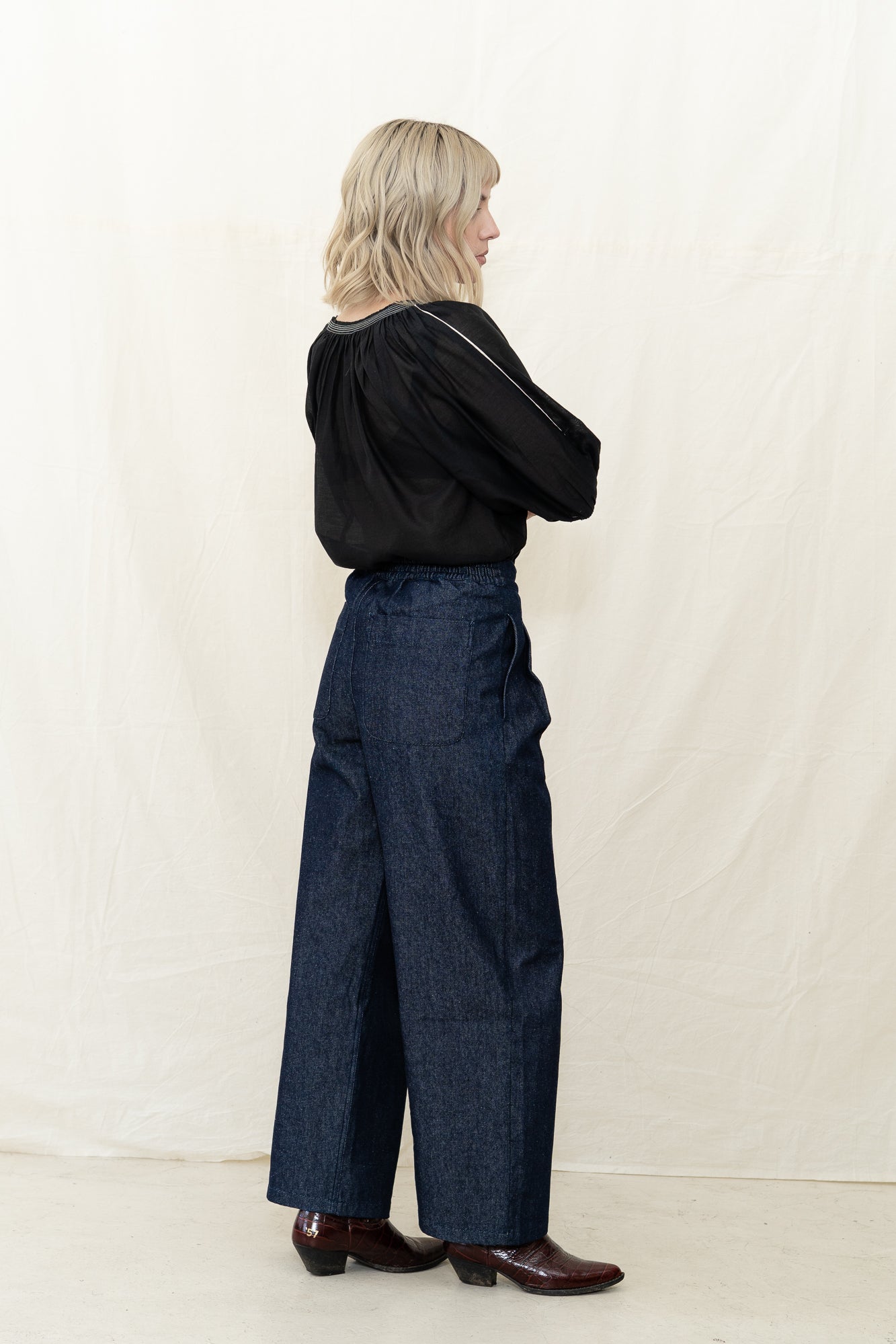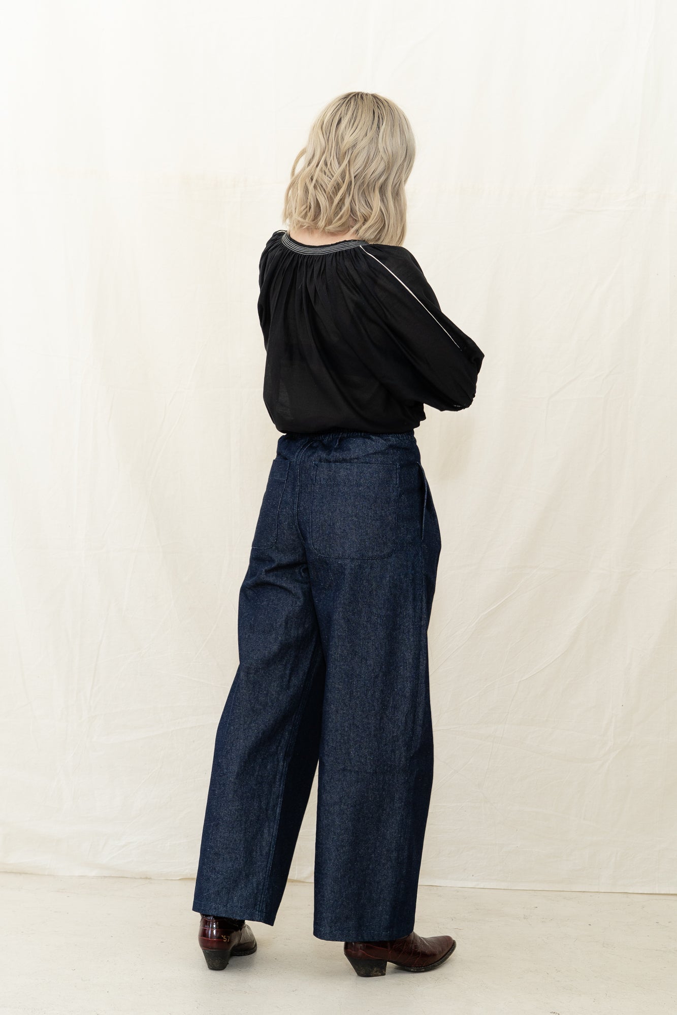 The new NYMANE Hilma top for women brings a modern twist to their classic design, crafted from semi-transparent, hand-spun black silk cotton. The fabric lends a sculptural, yet bohemian feel to the garment. Signature details, such as delicate hand pleating at the neckline with a contrast white top stitch and a fine white piping at the sleeve accentuate its beautiful shape. A small mother of pearl button at the neckline and elastic cuff at the sleeve round out this incredible piece.