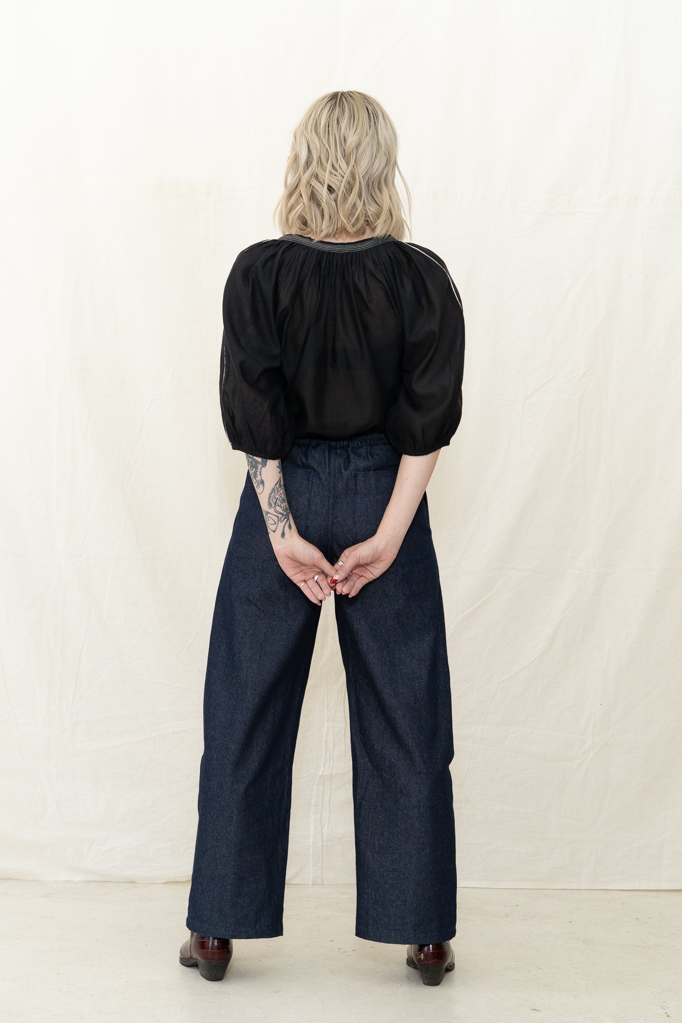 NYMANE Wes Pleat Pant for women combines soft tailoring and relaxed ease to create the perfect women's trouser. This wide leg pant has a stitched pleated front and a partially elasticated waistband. It features side seam pockets and single back patch pocket. It's finished in deep indigo denim.