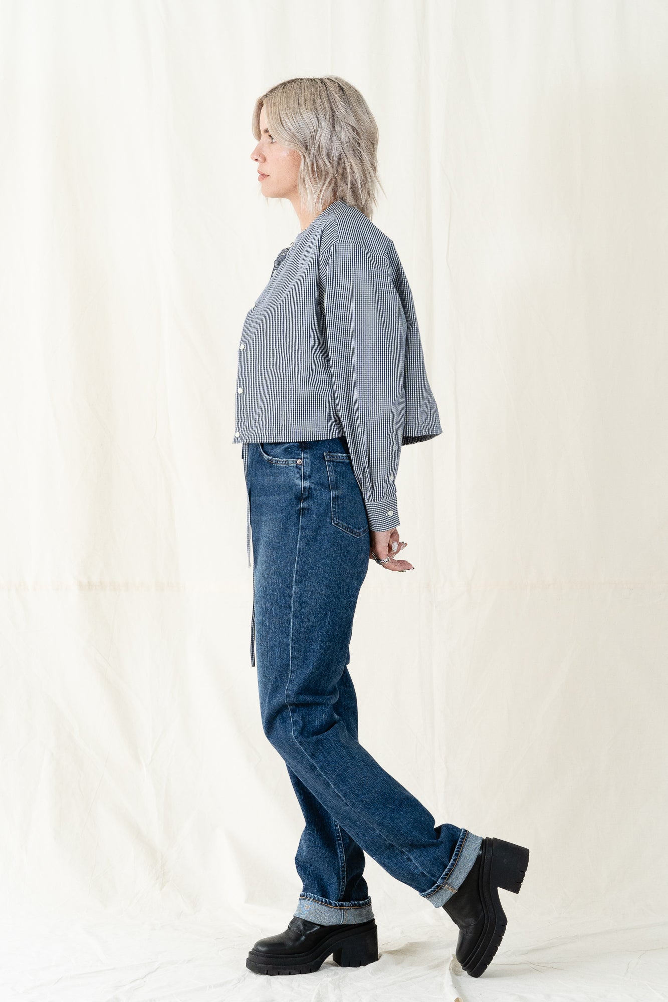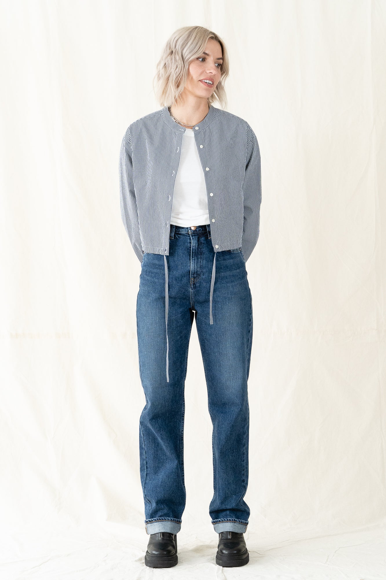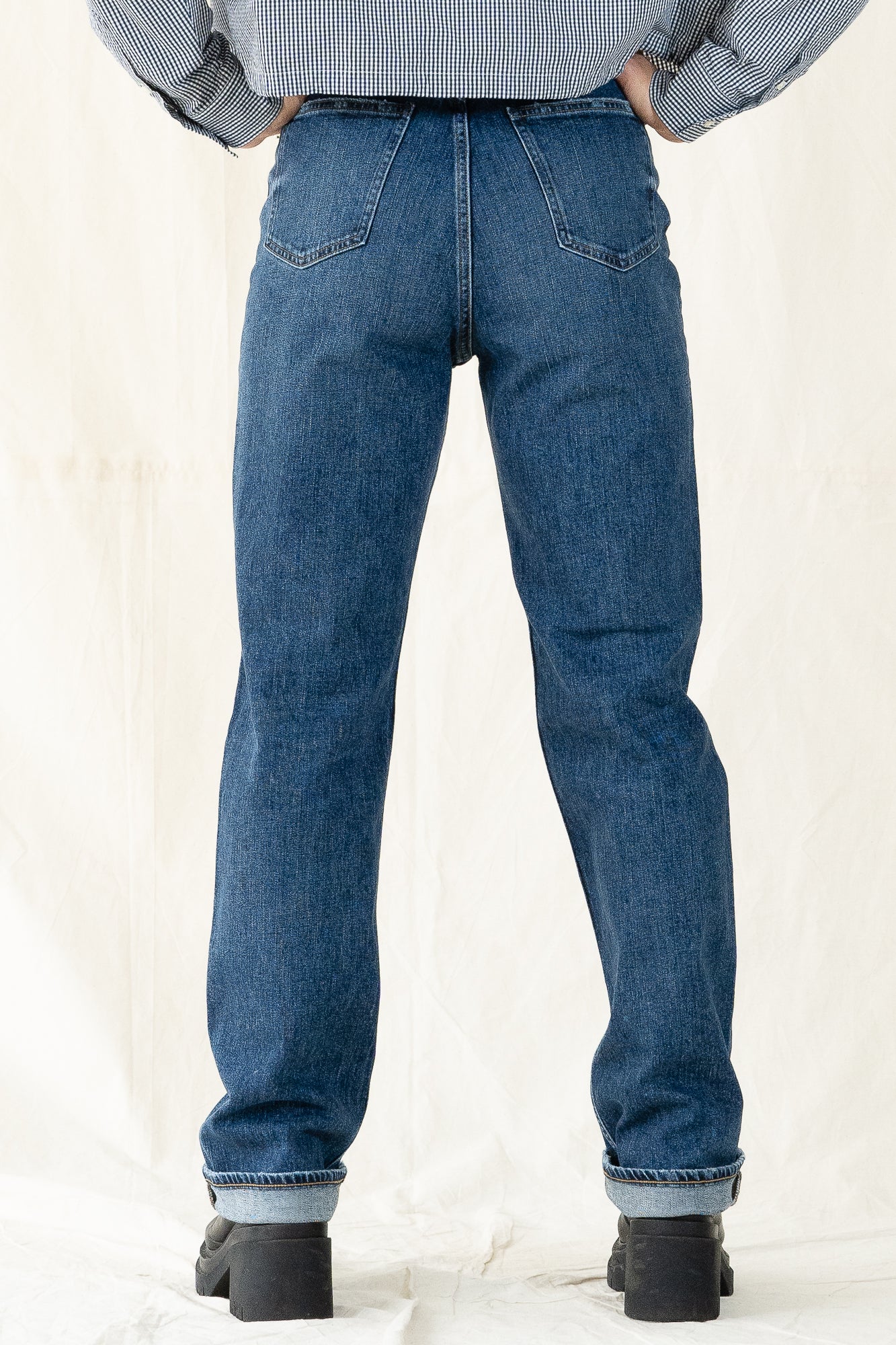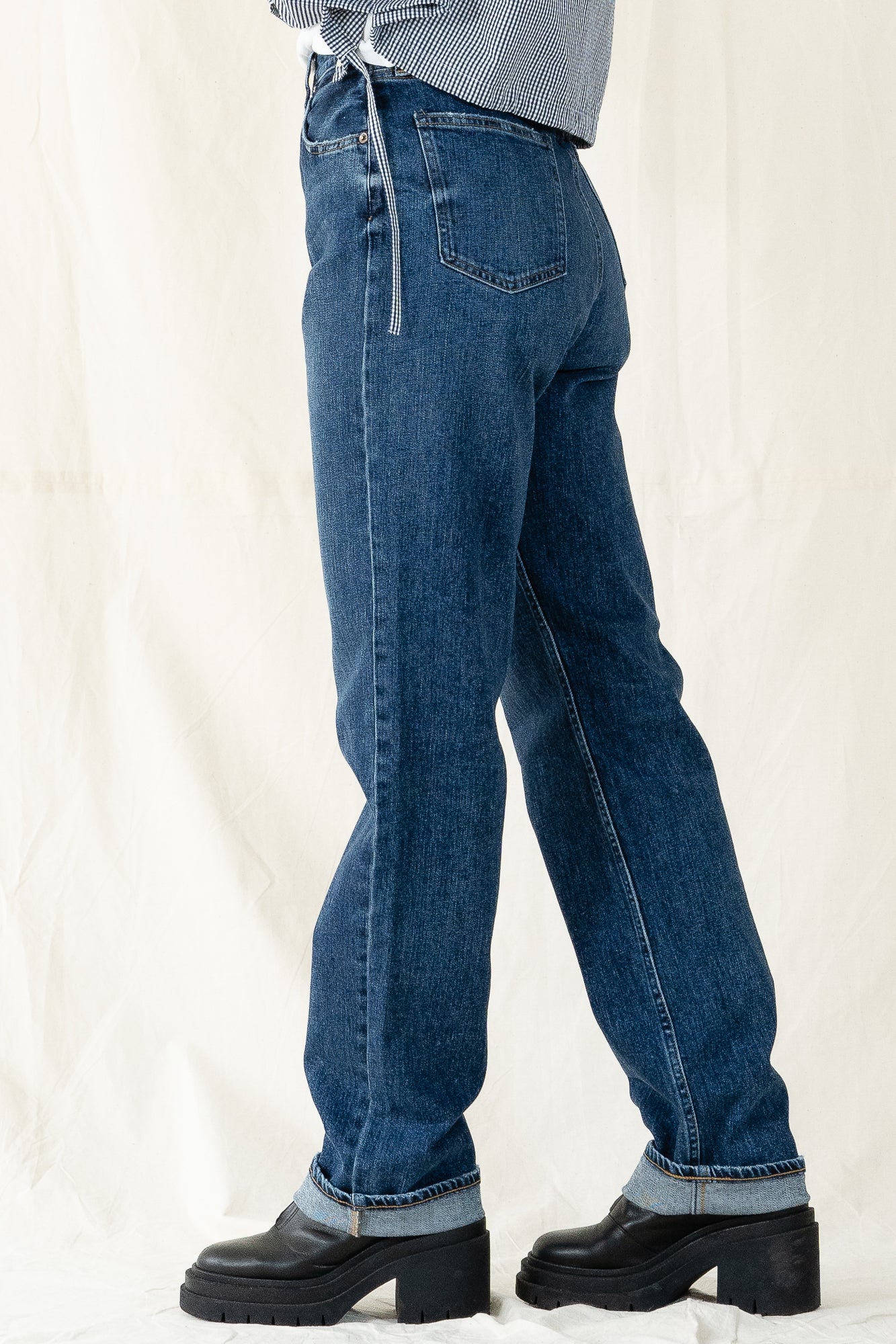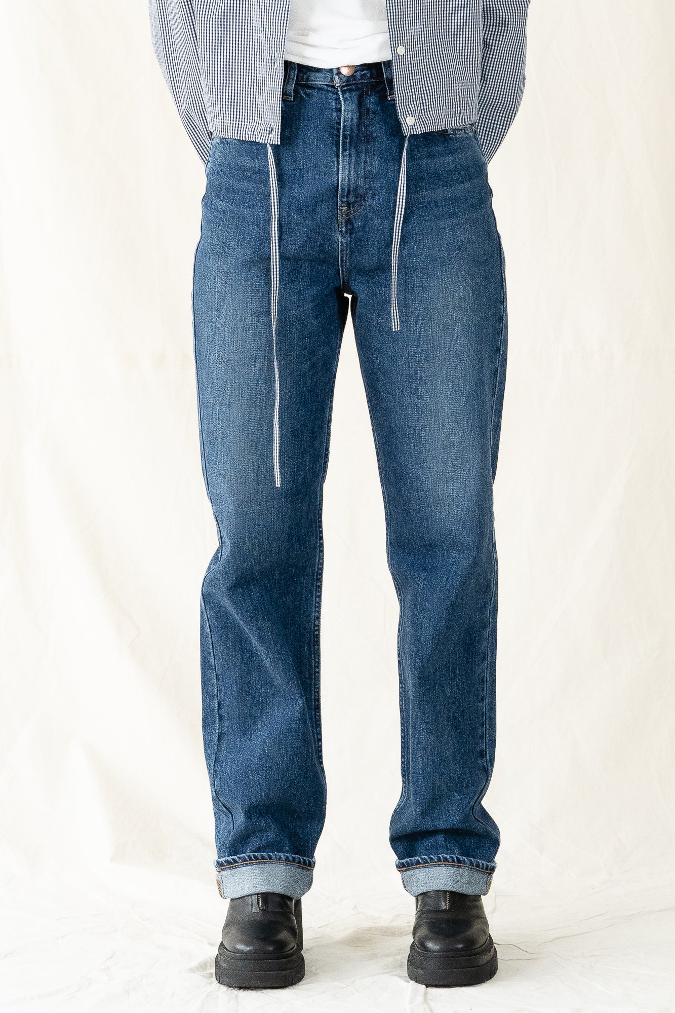 Red Card Tokyo "One-Day" denim for women a high-rise straight leg jean with a high waist and long legs. The waist and hips are more rounded and the length is longer. This new loose straight has a moderately wide and relaxed feel, while the feminine fit further enhances the leg-lengthening effect. The denim is made of Kaihara stretch denim, which has a rough, denim-like feel with the appearance of 100% cotton.