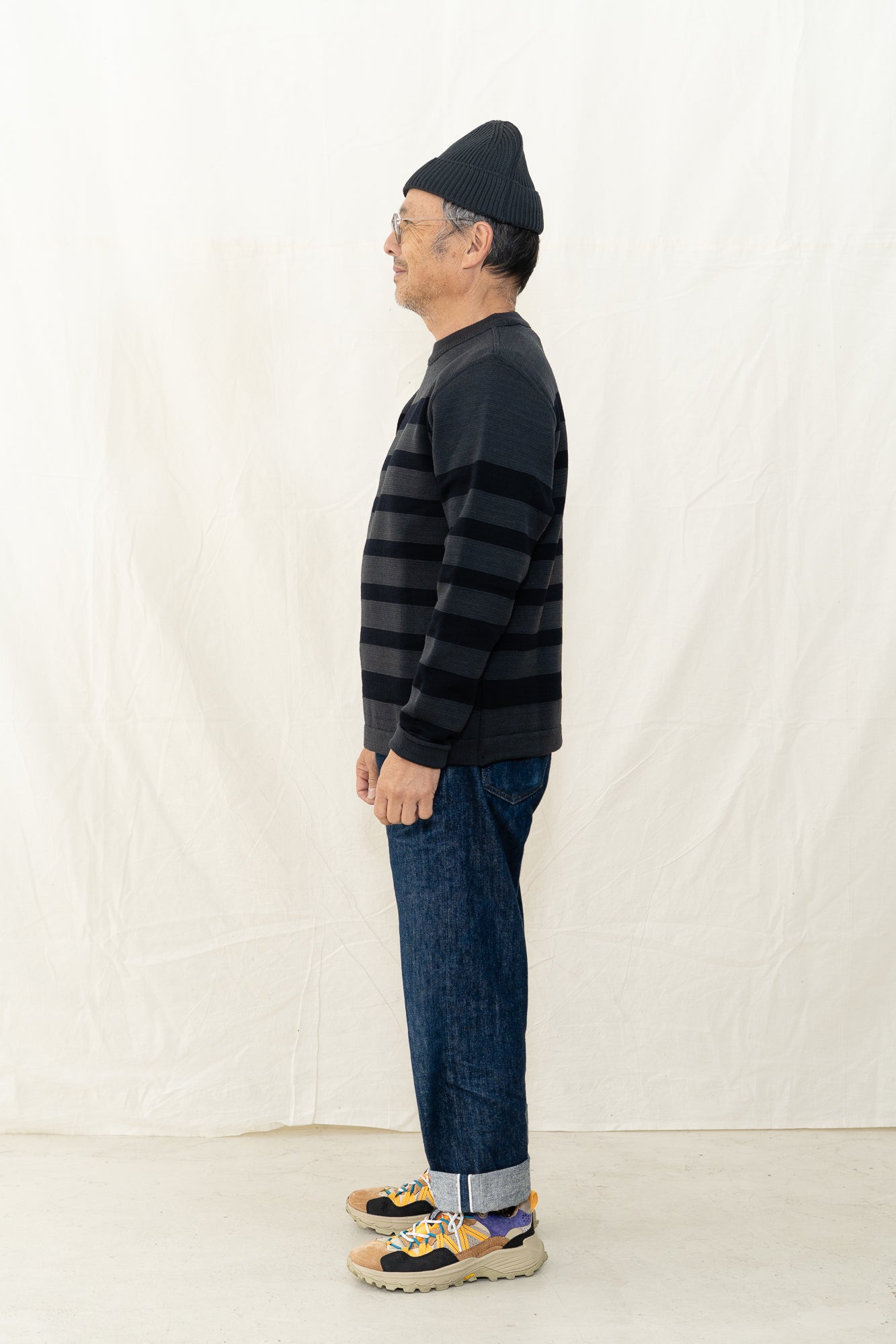 S.N.S. Herning Given III crewneck sweater for men. A faithful reinterpretation of the classic Naval stripe with enlarged stripes and mixed knit techniques for a rich surface. Heavy yet easy to wear due to its boxy/roomy fit. A beautiful, tactile feel rounds out this great piece.