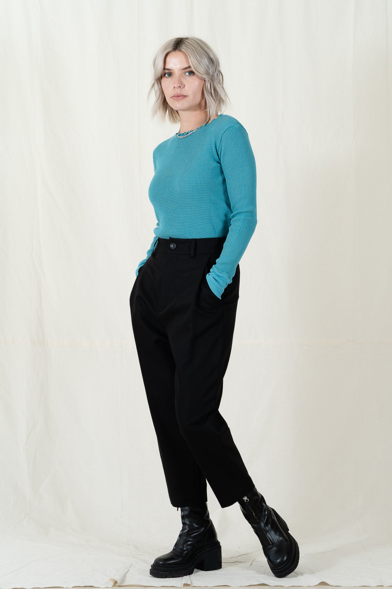 V::Room long sleeve crew neck top for women is a heavier weight original waffle rib combo tube knit. Knitted with vintage circular knitting machine, only few available in Japan. Waffle and RIb textures knitted in the same time without seam. Very durable, long life. Cover stitches around neck and bottom. Cuffed sleeves.